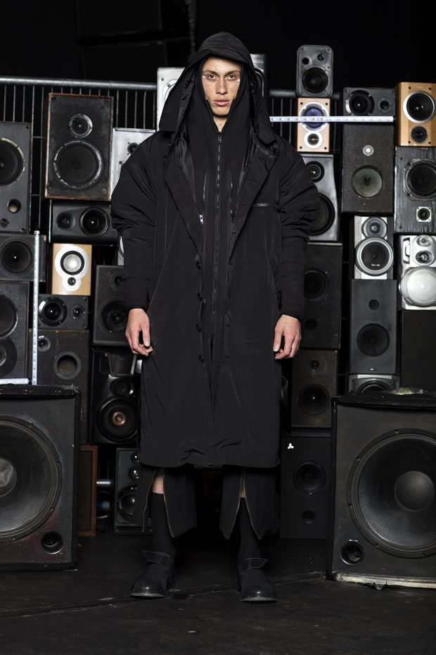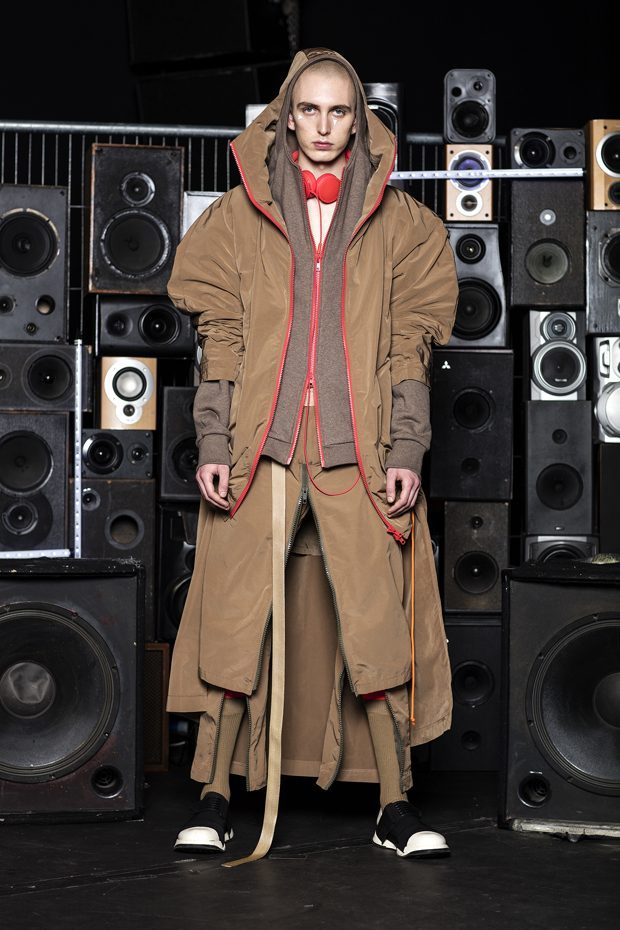 Baseball has always been huge in Japan – the posters I remember were an eclectic mix of both Japanese and American aesthetic. It was the basis of the collection, yes, however I used fabrics to create truly contemporary pieces. Nylons and inflatables are seen alongside heavy plaids – this along with the shapes create a contrast I really love.