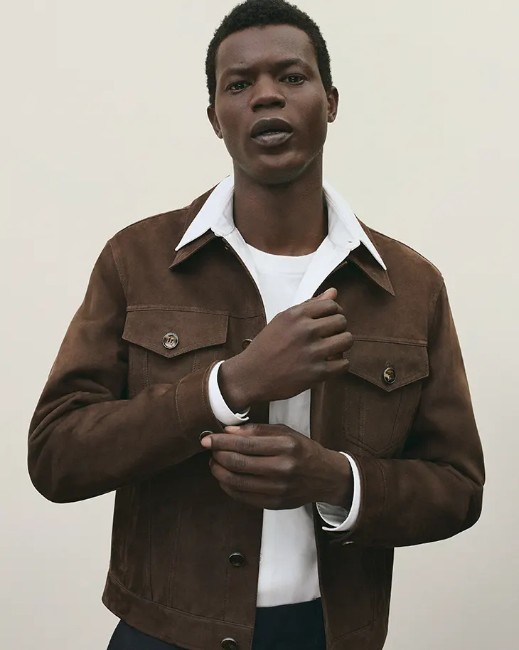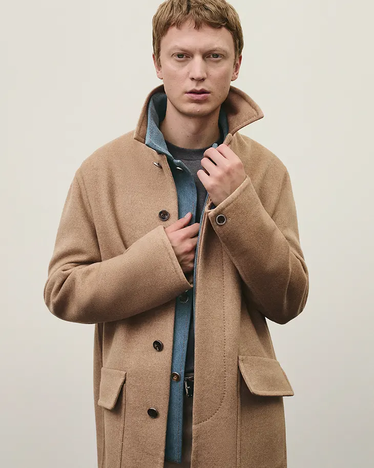 Relaxed tailoring anchors the wardrobe. Suits in breathable silk-wool canvas balance durability with refinement, while silk-cashmere blends introduce lightness. Double-face wool-cashmere blazers appear unlined for flexibility and ease. Off-duty staples elevate the weekend register: a light trucker jacket and hooded blouson in velvety nubuck, a knitted hoodie in double-face cashmere, and a cotton-silk denim work suit that unites toughness with tailored precision.