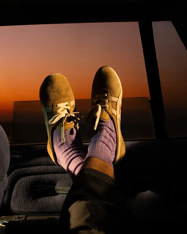 Double stitching reinforces the signature Onitsuka Tiger stripes, sharpening their structure. The Medusa emblem appears on the tongue through studded elements that introduce a clear reference to Versace. The upper undergoes washing or buffing, creating a worn surface that alters the finish and texture of each pair.