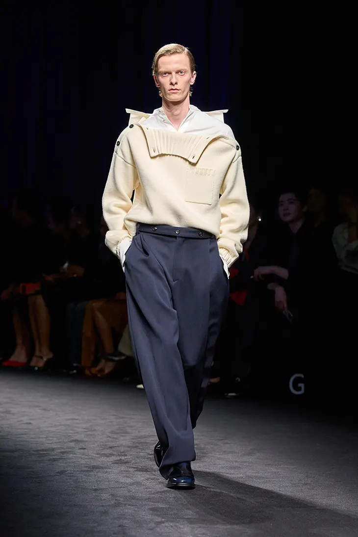 Maritime dress forms a key point of departure, with sailor uniforms informing proportion and garment structure. Davis links this reference to stories of relocation across water, including Salvatore Ferragamo’s move from Italy to the United States and his own family’s journey from Trinidad and Jamaica to Manchester. Elements associated with naval clothing appear in altered configurations, including shifted button placements, opened closures, and reconstructed fastening systems. Material treatment transforms these references. Knitwear undergoes needle-punching with chiffon to introduce dimensional texture, while parkas appear in nappa leather with shearling integrated into the hood, redirecting workwear into a new material context.