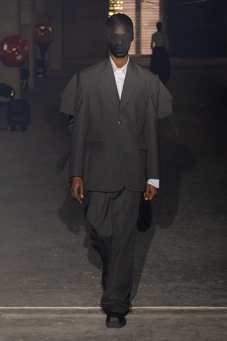 Tailoring carried the tension of duality. Suits appeared formal at first glance, but their cuts and proportions twisted the codes of corporate wear. Shoulders exaggerated, waists dropped, and fabrics shifted between matte and reflective, turning businesswear into armor. Oversized shirts hung open with precision, while trousers fell in sharp folds that distorted symmetry.