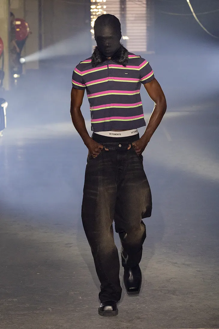 The slogans returned, cut into the collection’s rhythm. “I AM NAKED UNDERNEATH MY CLOTHES” appeared across fitted tees, a reminder of exposure beneath uniformity. Rhinestoned Paris souvenir tanks shimmered under strobe light, collapsing kitsch into irony. Striped polos, cropped track jackets, and wide cargo pants expanded Vetements’ vocabulary, layering references from streetwear, club culture, and everyday utility.