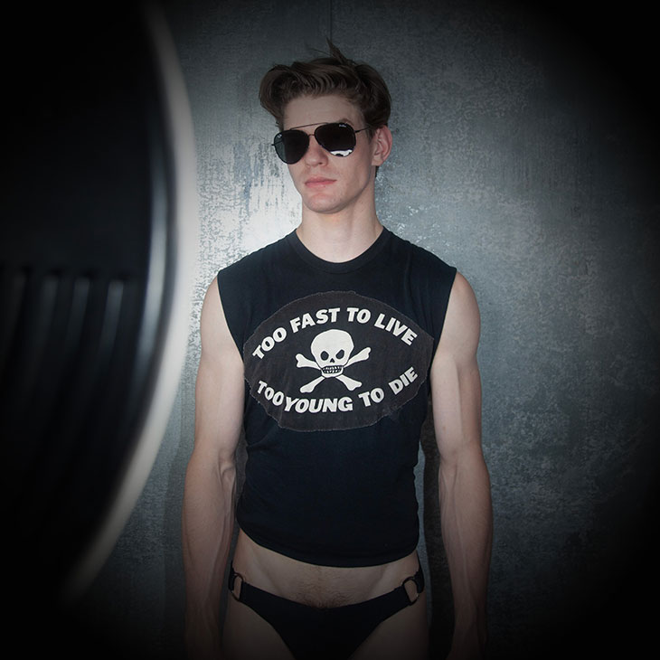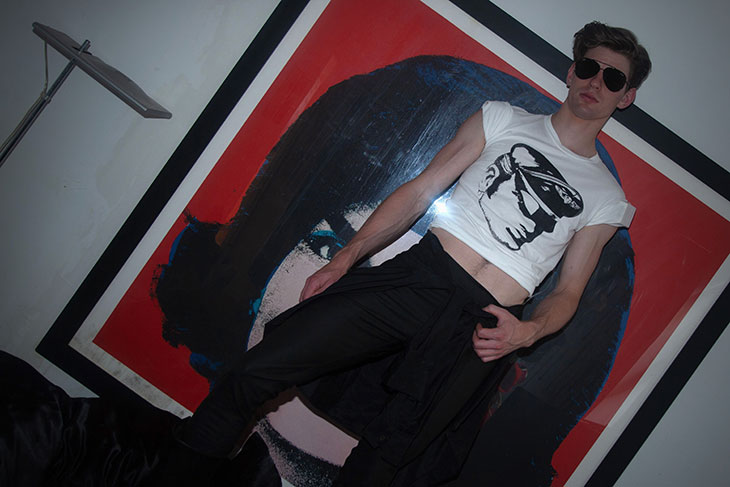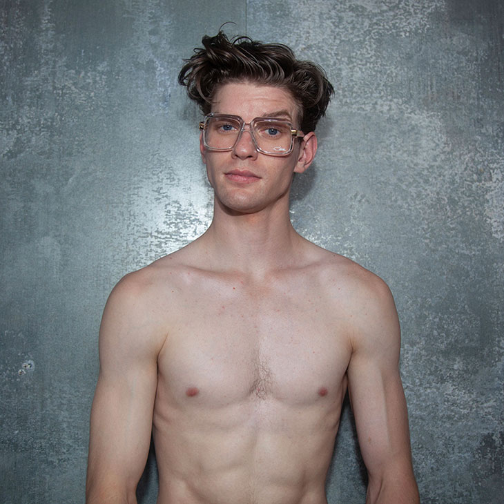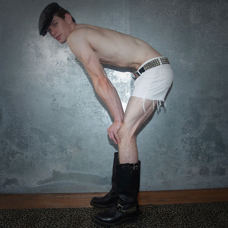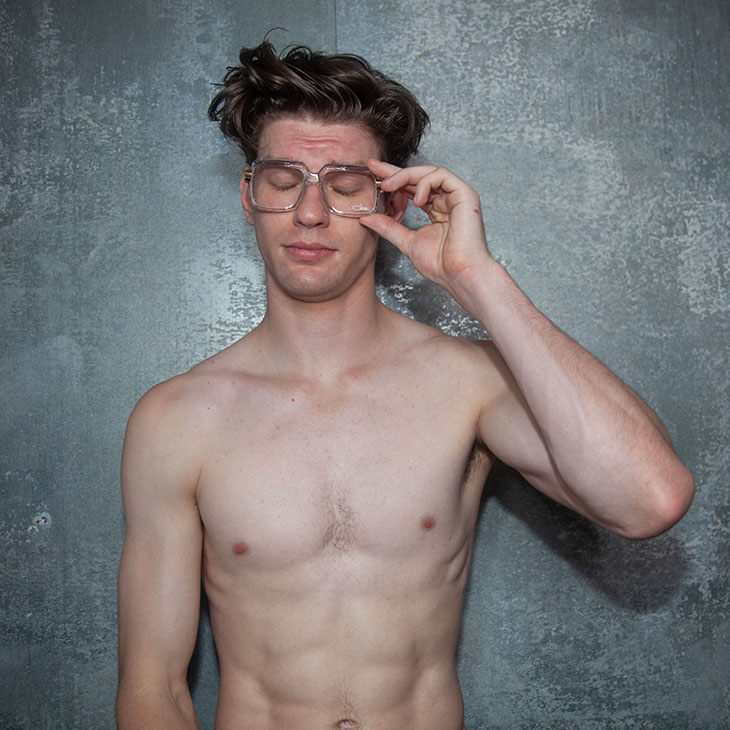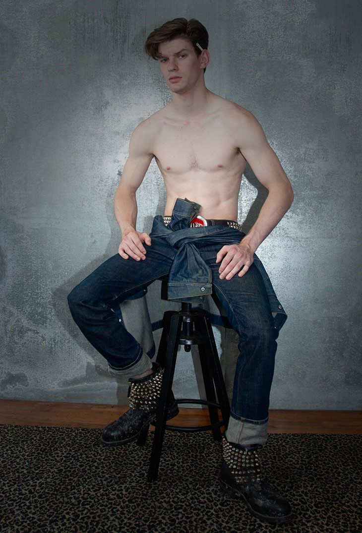 For this session, August is wearing selected pieces from Cazal, 99 Wooster, The Leatherman NYC, Ildes, Levi’s, Dsquared2, Bess NYC, Personal Fears, Kangol, American Apparel, Rayban, Vivienne Westwood, and Rufskin.