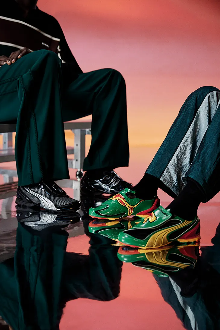 The season also introduces an early preview of the next PUMA x Ahluwalia release. The VS-1 trainer appears in two colorways and draws from grassroots football and fan culture. Braided construction, layered tailoring, and symbolic embroidery define garments shaped by connection and shared networks, translating interpersonal bonds into physical form.