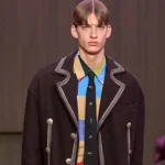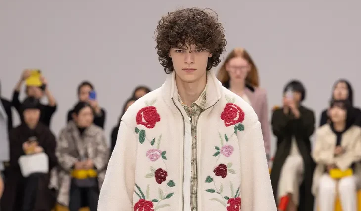Wool suiting incorporates devoré textures that introduce layered surface depth. Laser-treated and braided denim expands the visual vocabulary through controlled pattern and texture. Relaxed utility silhouettes appear alongside knitwear and outerwear constructed from recycled and organic fibers.