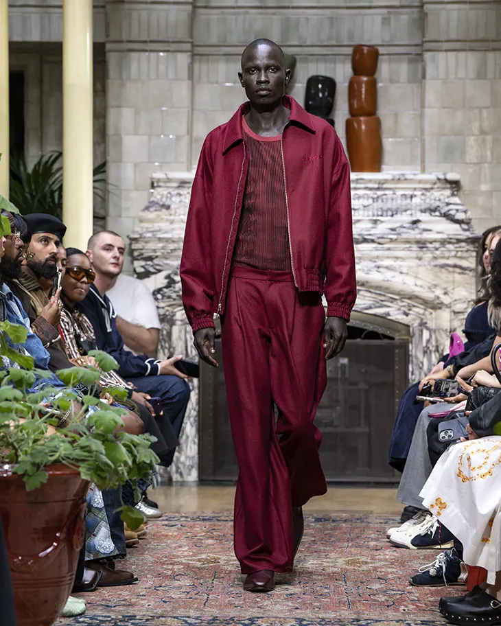 Ahluwalia reinforced her commitment to sustainability by collaborating with eBay’s Endless Runway, incorporating pre-loved materials into the collection, with select pieces going on sale post-show to benefit the Circularity Project. A continued partnership with PUMA introduced a monotone trainer in black and silver, a streamlined update with mesh cutouts and a metallic-effect midsole, while also extending the mentoring program for emerging talent.