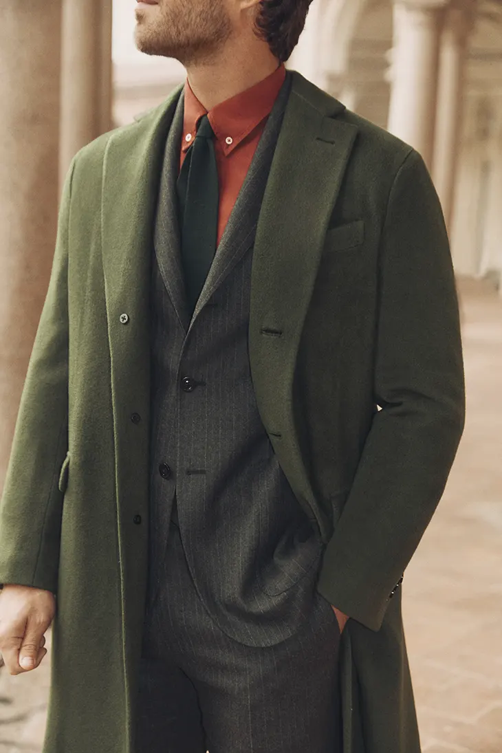 An urban narrative structures the collection across four chapters, each aligned with a different moment of the Milanese day. Color and material shifts guide these transitions while preserving coherence throughout. Deep blues and greys anchor the business-facing chapter, establishing a restrained foundation. Beige tones follow, softening the palette and introducing balance. Sage with luminous undertones leads into autumnal shades connected to Brera, where Boglioli green takes on a defining role. Leather tones, camel, cocoa, and mauve conclude the sequence, shaping a quieter register associated with more private settings.