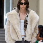 Nicola’s looks center on quiet refinement. She wears relaxed tailoring and sculpted outerwear crafted in bouclé, wool, and tweed, softened by a palette of ecru, khaki, and taupe. Field jackets and pea coats come detailed with leather, nylon, and shearling accents for texture and structure. “My style is very in the moment,” she says. “I became obsessed with the Moncler jeans I wore in the campaign and ended up wearing them in my new movie.”