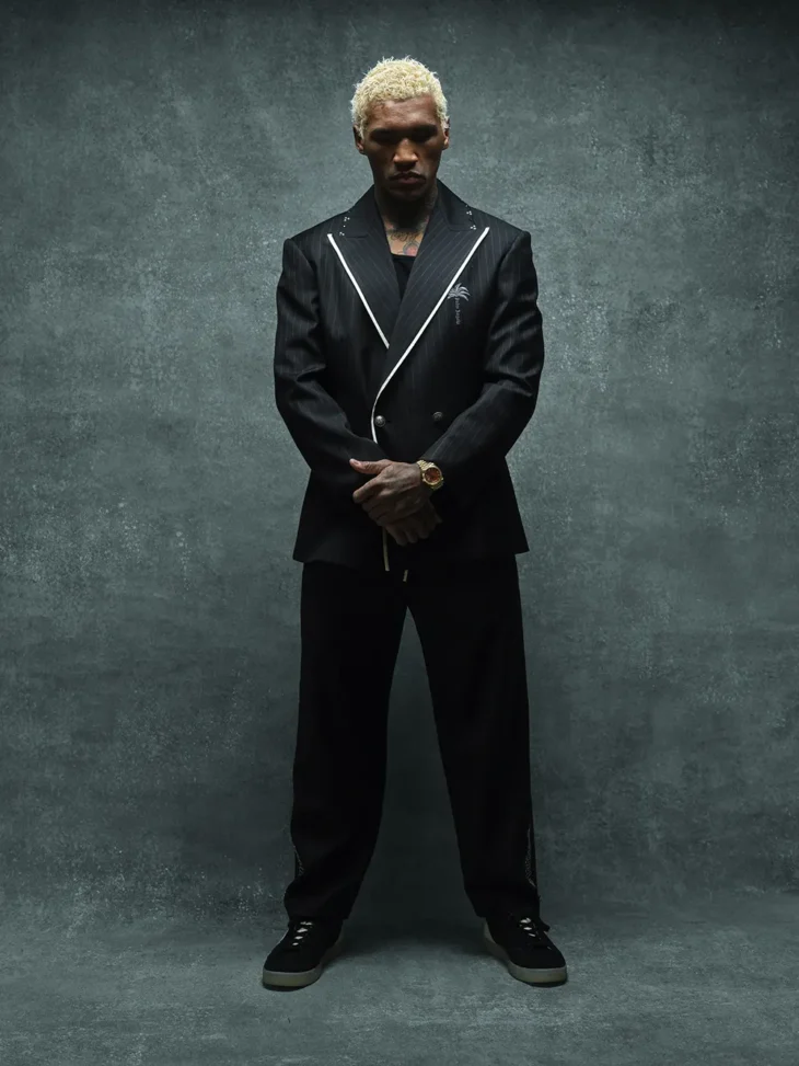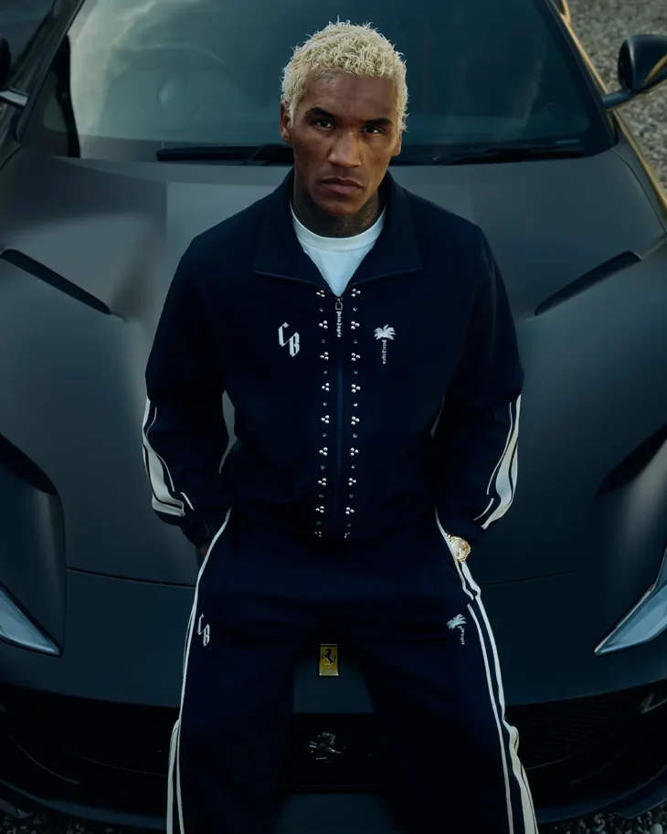 Outside the ring, Palm Angels extends the collaboration through tailored pieces worn during press week. A double-breasted blazer and pleated trousers appear in a sharp pinstripe, marked with a studded palm logo and Benn’s monogram. A second look reworks the tracksuit format with crystal embellishments and custom graphics, offering a preview of the brand’s Fall Winter 2026 direction.