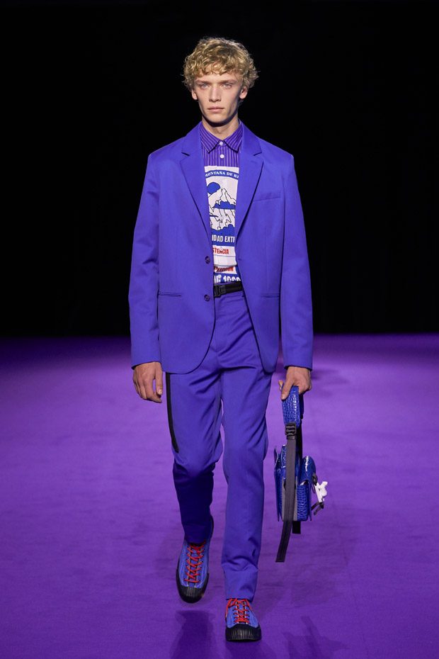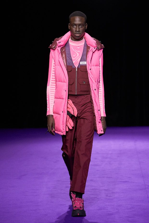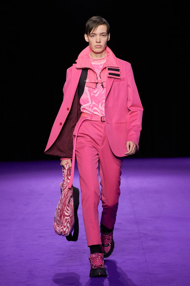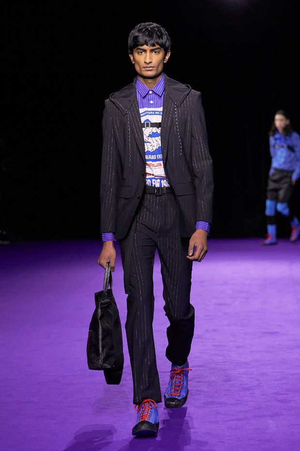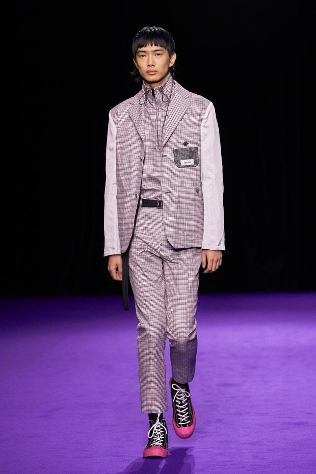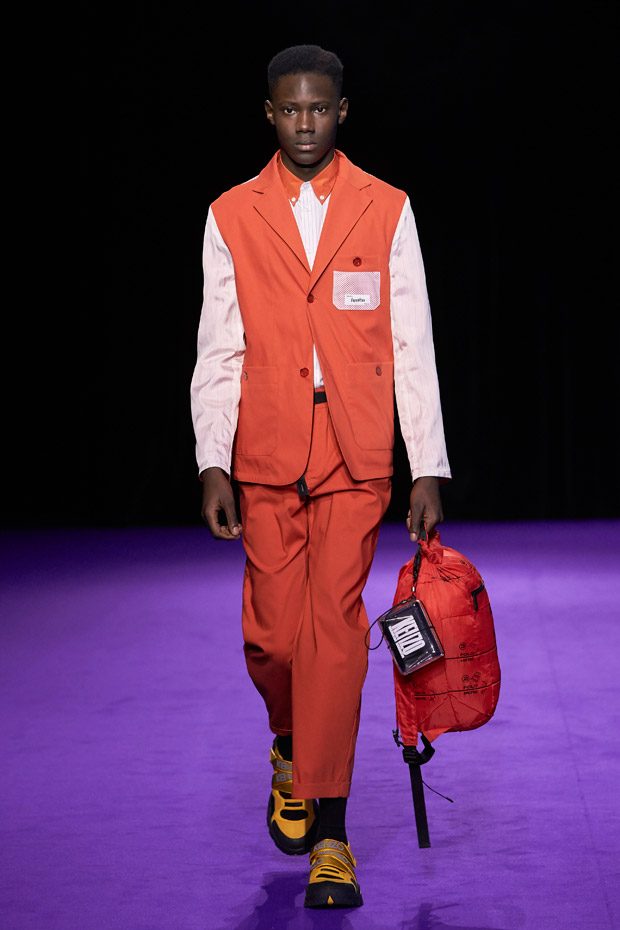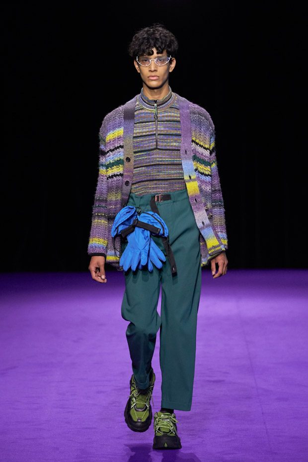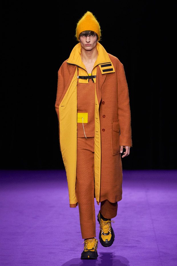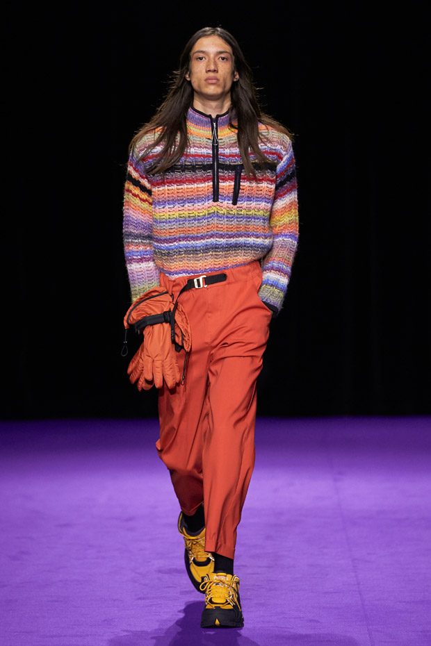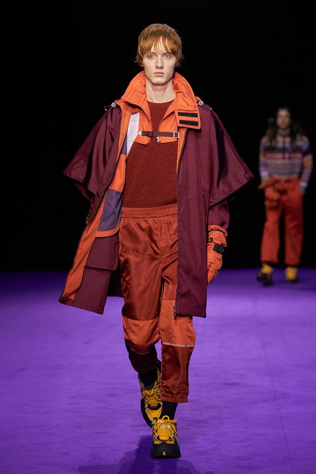 Menswear takes the road less traveled, keeping in mind the military trappings of early explorers. Transformable all-weather outerwear pieces feature harness collars, reversible mesh linings, and detachable pocket gloves. A membrane coating gives pop tailoring extra bounce, as zip-up polar fleece returns in roomy quilted jogging pants (mimicked elsewhere by luxe striped shearling). Worn with plaid felt overcoats and checkered crew knits, straight canvas trousers zip-off in color-blocked panels. In the same way, a three-pocket bag zips out into backpack, tote, and fanny pack shapes.“