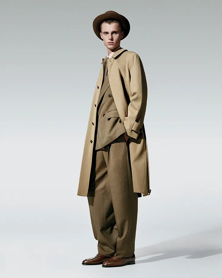 Garments follow the body with fluid precision, allowing natural movement and relaxed structure. Blazers and coats appear single or double breasted, finished with peak or shawl lapels. Tailored two-pieces and suiting establish composed formality within the broader wardrobe. Clean lines and balanced proportions define the collection’s pragmatic tone.