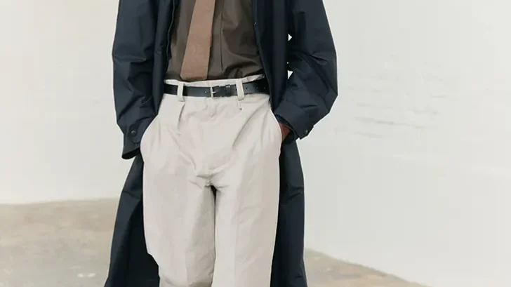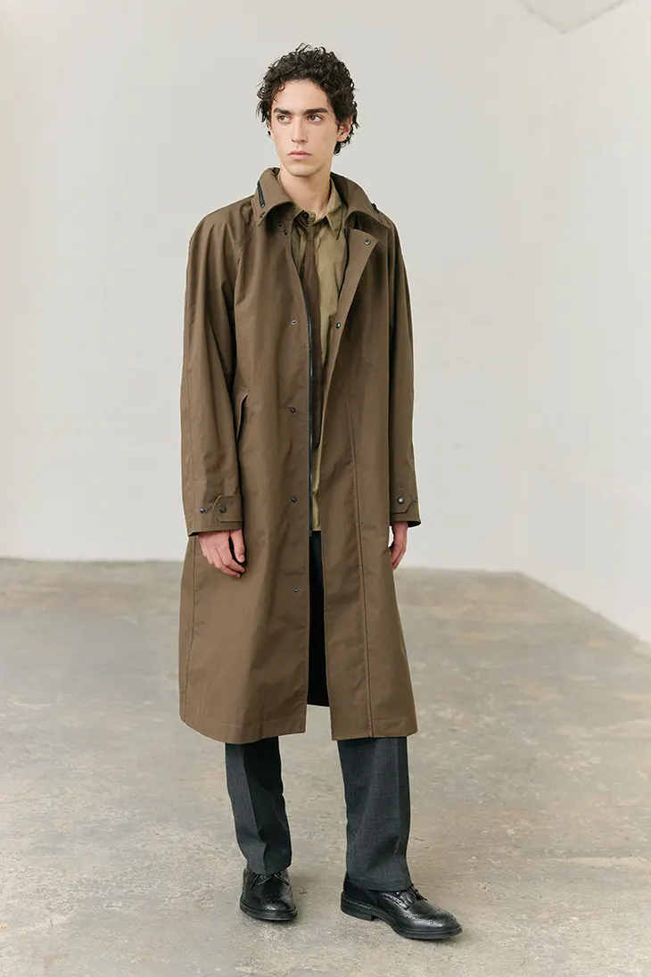 Outerwear continues this direction. The Short Trench, fabricated in Ventile dry cotton poplin, includes a storm flap and minimal detailing. Neutral shades and a clean construction keep it versatile as a layering option.