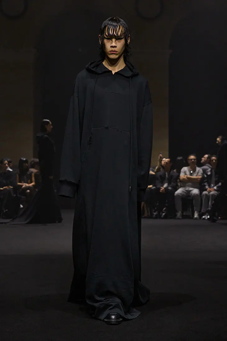The second tableau turns toward community. Since their first Paris presentation last year, Matières Fécales has gained a following often described as a cult audience. Supporters identify strongly with the label’s values and aesthetic language. Dalton and Bhaskaran translate that connection into garments worn by friends and collaborators. Jersey hoodie capes appear with elongated kangaroo pockets and introduce silhouettes shaped by collective identity. These pieces oppose the codes presented in the opening sequence and reflect resistance to rigid social expectations.