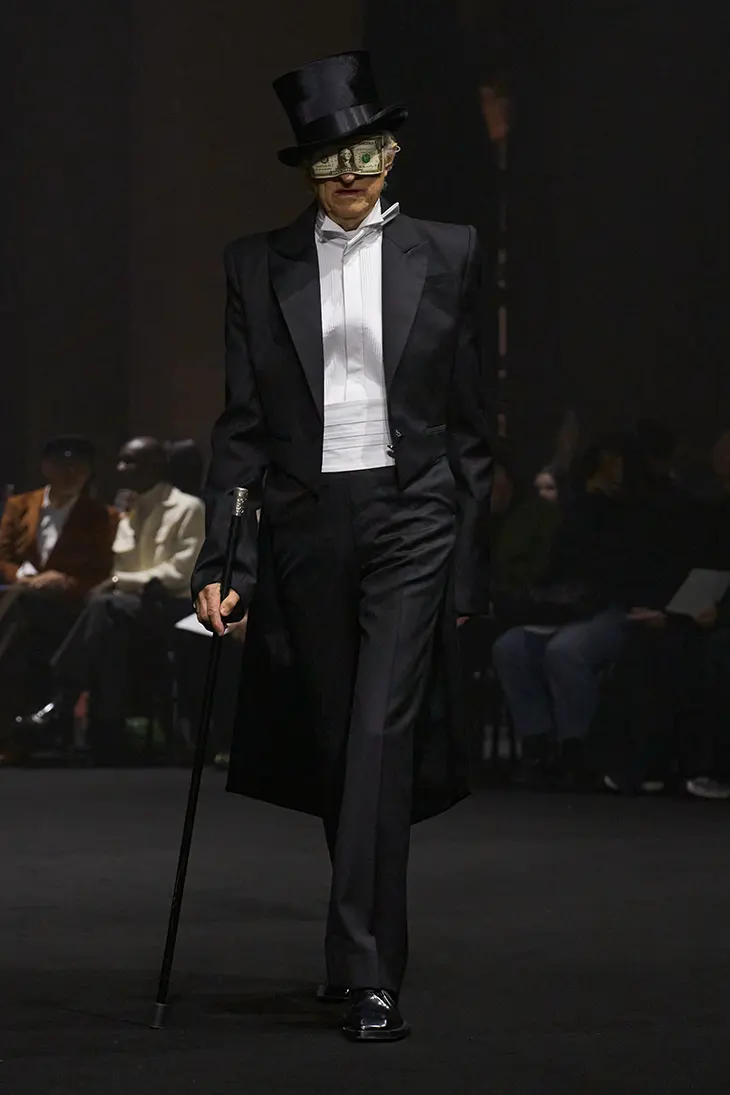 Daywear in the same tableau features masks that conceal the wearer’s gaze. The designers select fabrics associated with luxury wardrobes. Wrap coats appear in double-faced cashmere. Tailored garments use Prince of Wales cloth produced in Manchester.