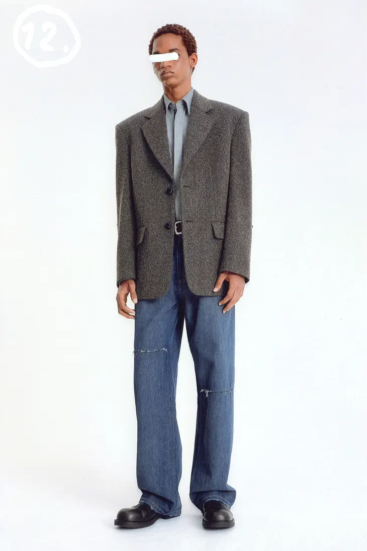 Tailoring anchors the collection and undergoes the most direct intervention. Jackets and coats feature slits, openings, and reversed elements that adjust proportion and alter how each piece sits. An inverted workwear jacket stands out, defined by an oversized collar and pocketing that appears flipped outward.