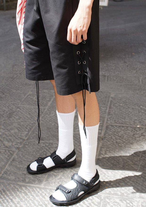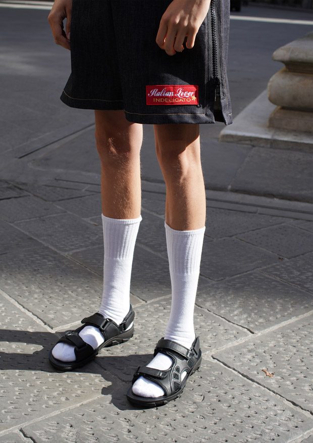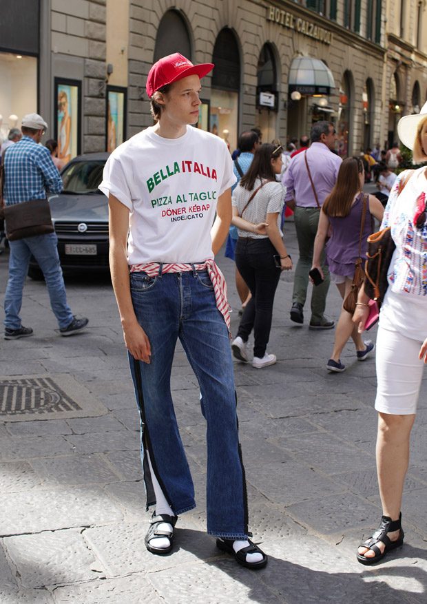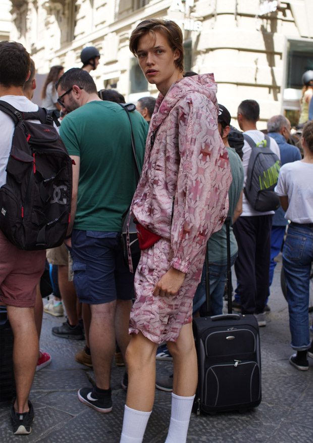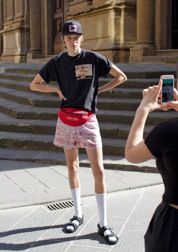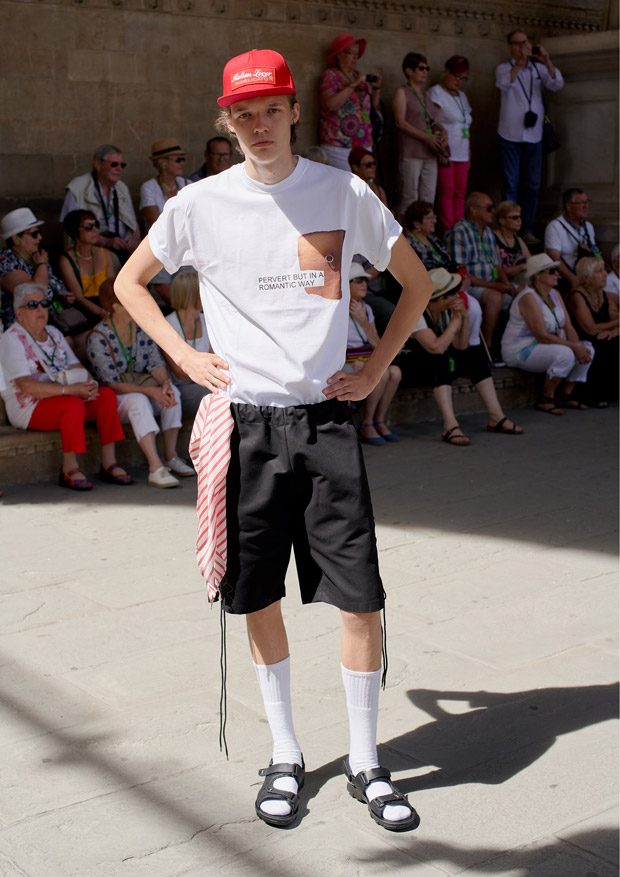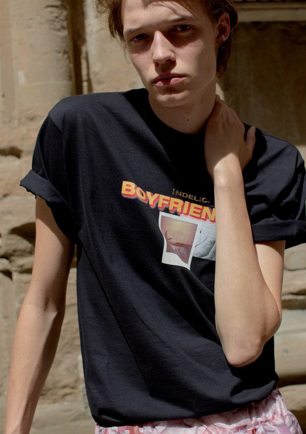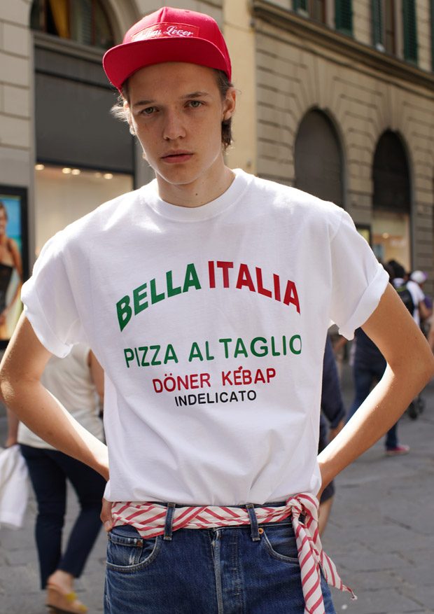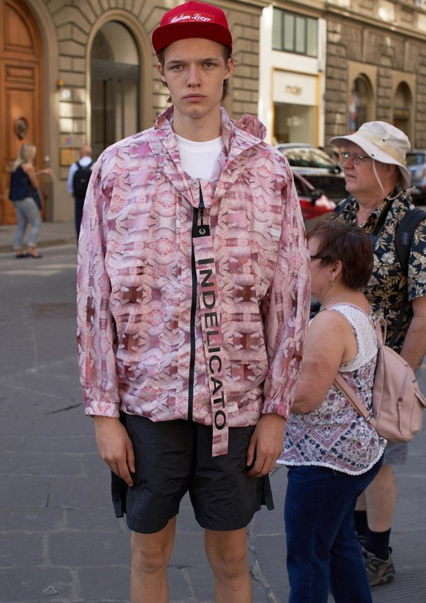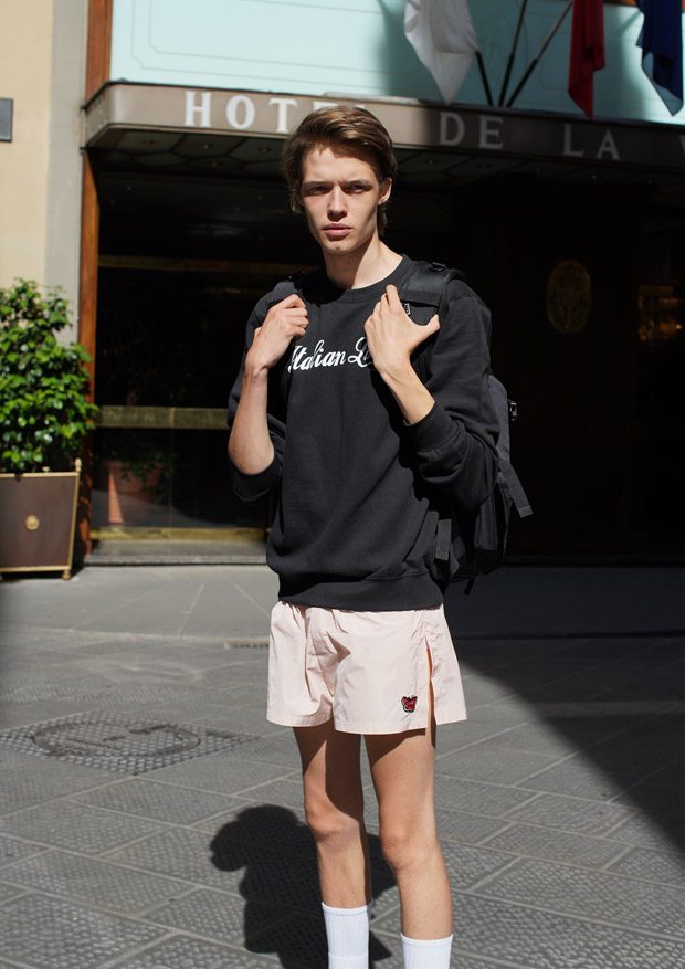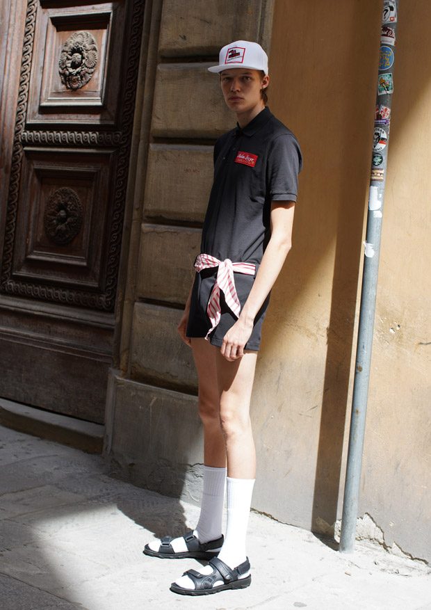 “Through this collection we follow an updated interpretation of what would be the wardrobe of a young boy landing in Italy and how it would evolve while he discovers the Italian taste and the “Napolitano” tailoring. There for the choice of mixing streetwear’s items as t-shirts and nylon full look, to represent the youth and the comfort needed of a tourist, and more dressed up and constructed garments.