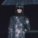 The show begins with a striking opening ensemble that pays homage to Rains’ iconic rainwear silhouettes. Models make their entrance into the dry show space, resembling figures emerging from a downpour, their hair saturated and their skin adorned with surreal raindrop motifs. The atmosphere is focused, drawing everyone’s attention to the electrifying energy emanating from the runway.