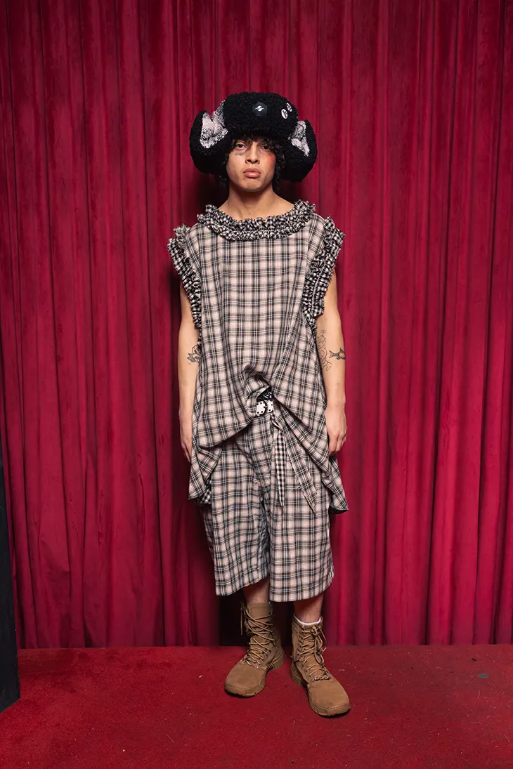 Plaid operates as a central code. This season, RIO enlarges its scale and deepens the palette for winter, applying it across tailored pieces and layered silhouettes. Pleated minis and draped separates interact with metallic bikini tops, while high-visibility accents cut through the looks with direct intent. Reflective textiles react to flash photography and stage lighting, transforming each garment into a surface that records movement and energy.