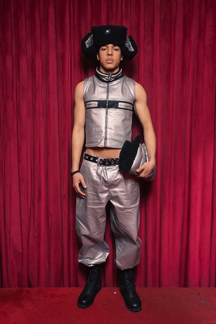 Outerwear drives the collection’s structure. Quilted builds, sculptural puffer shoulders, trapper hats, and sharply constructed coats create volume and authority. RIO engineers these silhouettes for the urban environment, pairing impact with function. Backpacks and sport-inflected details reinforce this direction, grounding the styling in everyday mobility. The pieces read as wearable armor, designed for confrontation, performance, and daily navigation through the city.