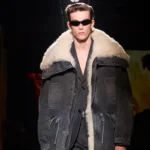 Layering structures the collection as coats, jackets, and knitwear build depth while allowing movement and flexibility. Outerwear plays a central role in this composition. Oversized coats wrap around the body and create volume without restricting motion. The Sandro studio places special attention on car coats, which appear as key garments throughout the collection. Designers craft these pieces from black double-faced leather or light shearling, materials that introduce texture and warmth.