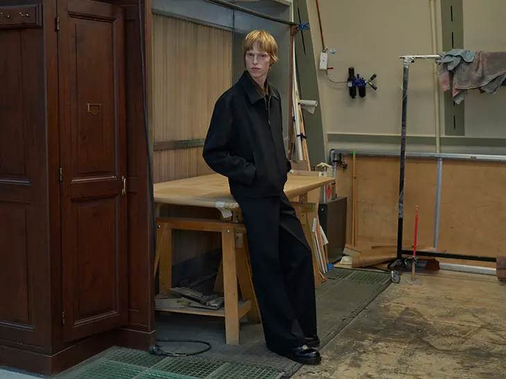 Double-faced wool provides structure and warmth across coats and outerwear. Cashmere introduces softness that complements heavier fabrics. Alpaca contributes additional insulation through enveloping textures suited to winter conditions. Patinated leather adds depth and character to jackets and coats. Neoprene-like finishes appear across selected garments and contribute a technical surface.