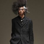 Songzio’s protagonist, the ‘misanthrope’, a man of stark appearance yet of poetic sensibilities, travels through the violent and dark rocks protected by the blue moonlight. As he walks through the spectral valley of silence and echo, darkness and light, eeriness and beauty, he is revealed and transformed. Songzio presents a collection with opposing aesthetics: Oriental yet Western, Rough yet elegant, angular yet rounded, dark yet colorful. With the highlighting notion of Metamorphosis, this season’s pieces are transformative, multi layered and multi textural. – from Songzio