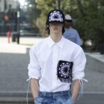 A sarong tied at the waist is this surfer’s go-to, printed with swirling designs such as sun-like shapes in green and sunflower yellow. The sarongs come with matching printed beach shorts. Nubbly, dry-touch knitted cardigans and vests are worn on top, layered with an oversized tailored jacket with sloped shoulders. Long sleeved striped knits are in relaxed fits, some with deep V necks.Easy to sling over, deep acid coloured cross body bags in mini sizes are where this surfer carries his essentials. Other bags include a printed gummy-touch sack that rolls from the top to close, printed rectangular shaped totes with long buckled shoulder straps, or with an image of Bob Marley Foundation, with a quote of his on the reverse. On the surfers’ feet, flip flops are swapped for tech sandals, leather sandals, white boot shoes and biker mode boots. – from DSQUARED2