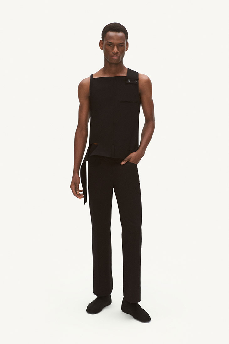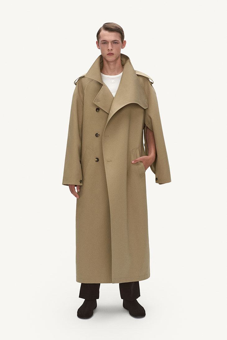 The menswear collection reimagines daywear classics with a fresh outlook. Lightweight fabrics allow the volumes to soar, creating dynamic, 70s-inspired silhouettes that are both sharp and relaxed. Incorporating athletic and watersport elements, such as asymmetric button-tabs and slip-on diving shoes, the menswear line infuses urban wardrobes with a sense of adventure and exploration. These pieces seamlessly blend functionality and style, embodying the essence of summer escapism.