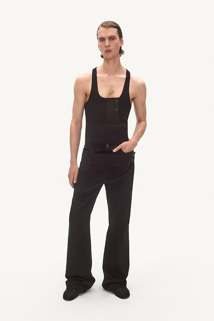 Inspired by vintage scuba shorts, Di Felice introduces sun-filled elements that add athletic accents to daywear staples. Asymmetric button-tabs, layered waistbands, and oversized belt loops reminiscent of André Courrèges’ SS70 collection create revitalized contrasts. Watersport-inspired pockets and slip-on diving shoes, adapted for urban wear in nappa leather and rich scuba jersey, evoke seaside adventures. The remixed scuba biker jacket, featuring a surf-inspired zipper puller and an extended locker loop, captures the spirit of ocean spray.