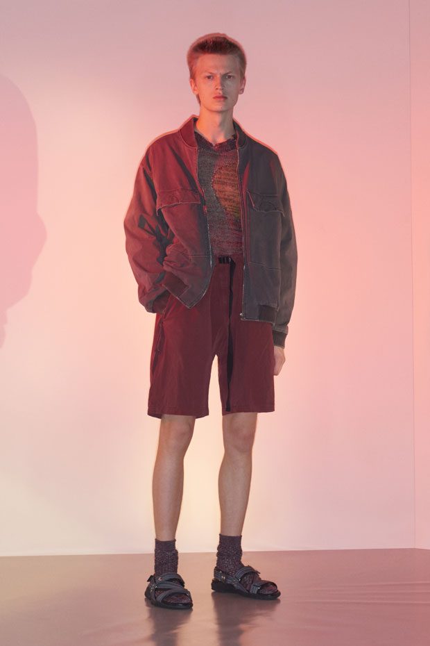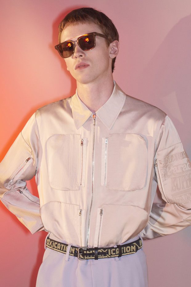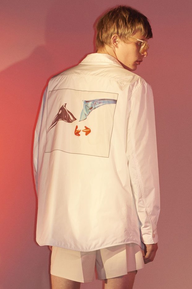 Tropical prints embrace the spirit of summer featuring scenes of volcanoes, palm trees, hibiscus flowers and birds of paradise on boxy retro shirting, bombers and t-shirts. A subtle English rose appears on silky jacquard shirts in apple green and chilli red. Multi-coloured pictorial knits feature sunsets and mouline skylines. Elsewhere fairisle tank tops come in neon colours. Romance and nostalgia of travel are explored on jackets and shirts emblazoned with a map of the Balearic Islands and a volcanic island scene brings to life shirting and trousers. Escapism wordplay is spelt out with striking words ‘fantasy’, ‘paradise’, ‘euphoria’, ‘desire’ and ‘infatuation’ which are printed, embroidered or hot fixed across the collection inspired by beaded bracelets from Mediterranean coastal towns. – from Stella McCartney
