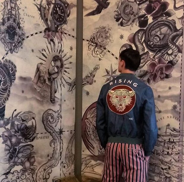 Behind the scenes moment Filip admiring the work of tattoo artist Coppoletta Designs, printed on canvas.