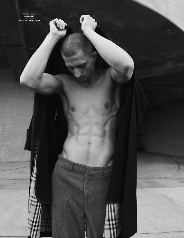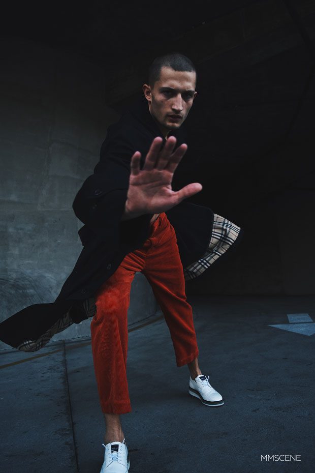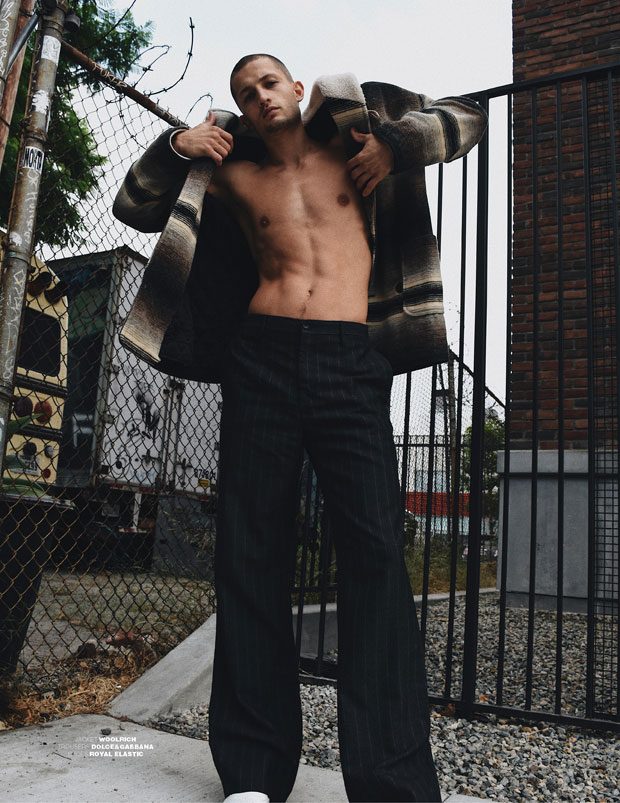 On today’s runways the tough boy look is no doubt a skinhead, Saint Laurent has had a few of the skins type boys, such as a breakthrough star Dalibor Urosevic, an unknown street kid from Serbia taken as brand’s face for the past year and exclusive. While the star of our shoot Frederik Woloszynski is enjoying his share of runway success thanks to his ‘peanut head’ hair style landing the pages of L’Officiel Hommes but also top brand runways such as Astrid Andersen, Philipp Plein, KTZ, Dolce & Gabbana and Moncler to name a few.