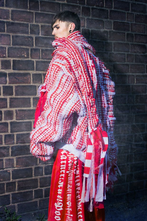 My collection ‘Schwalbe’ draws inspiration from hooligans. The Lexi Alexander movie “Hooligans (2005)” is a huge source of inspiration. It showed me that hooligans as a group have an aggressive appearance, yet if they get singled out they are vulnerable individuals. I’ve tried to adapt this duality in my materials, for example working with very fragile fabrics that I developed myself or by manipulating an existing fabric to be more fragile.