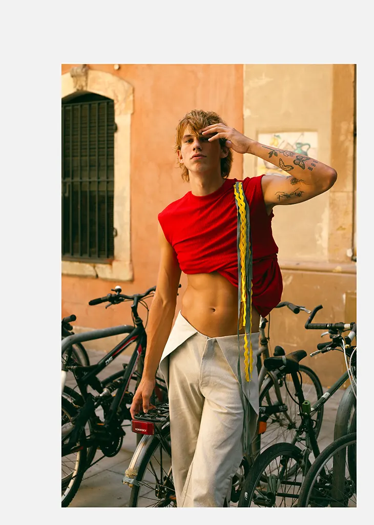 Models Tomas Pyzynski and Luciano Camilleri front the latest MMSCENE STYLE STORIES, Final Law of Vibration,  photographed by Ángel Castellanos and filmed by Daniel Simón. Shot outdoors on a bright day, the editorial unfolds across sunlit streets, where movement and spontaneity shape the mood. Castellanos’ lens captures the raw energy of Barcelona with precision, allowing natural light to define rhythm.