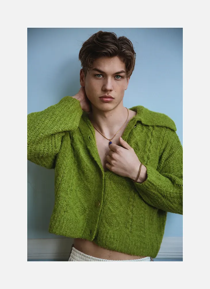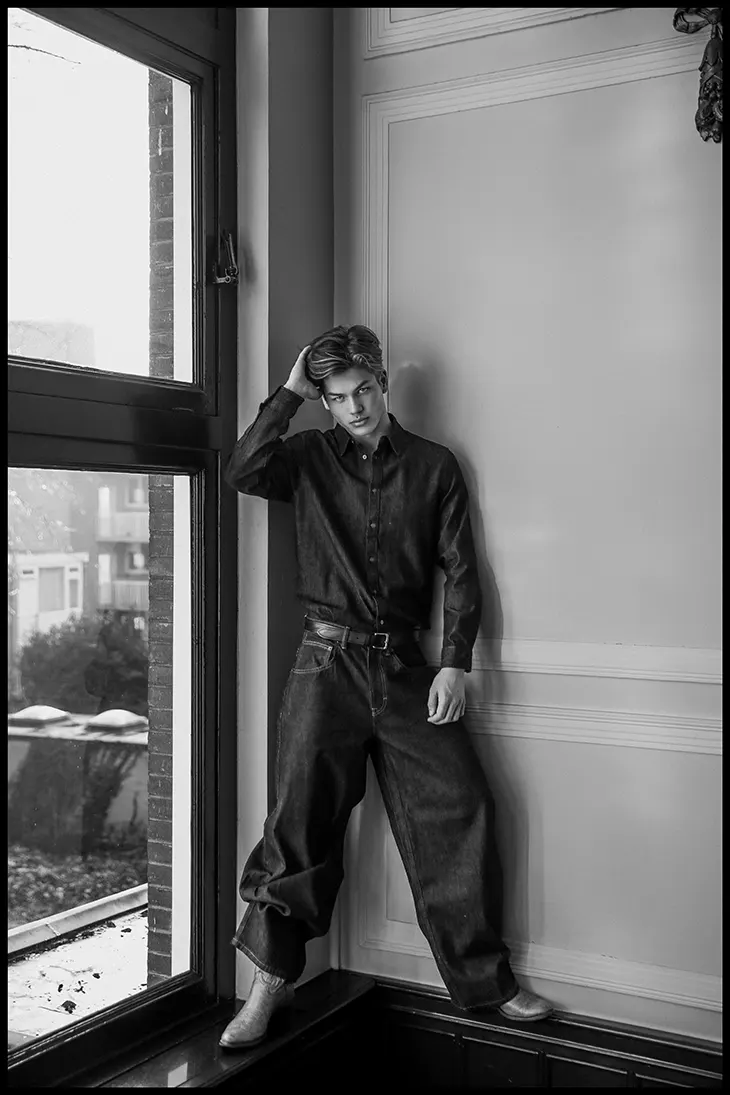 Smouter structures the wardrobe through a mix of tailored pieces, underwear styling, and Western references that move in and out of focus across the series. The selection includes Bailey, Zara, Michaelis, Justin Boots, Melvin & Hamilton, SNOCKS, Claudie Pierlot, Next, Ralph Lauren, Calvin Klein, adidas Originals, Essence Amsterdam, Tommy Hilfiger, Guess, Ruslan Baginskiy, Claudio MAURITIUS, Bershka, DSQUARED2 ICON, Al Coro. Arjen van Baren wears Next, adidas Originals, Nils, Bershka, Essence Amsterdam. The editorial closes with a steady focus on presence and tension, carried through to the final frame.