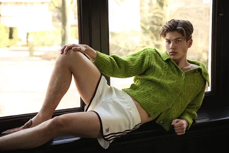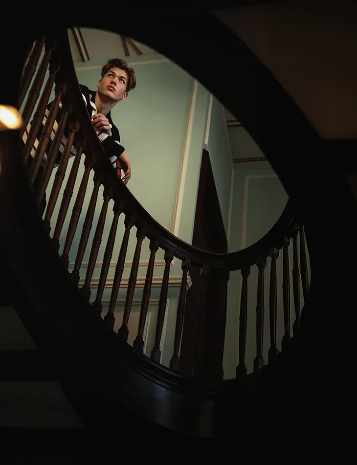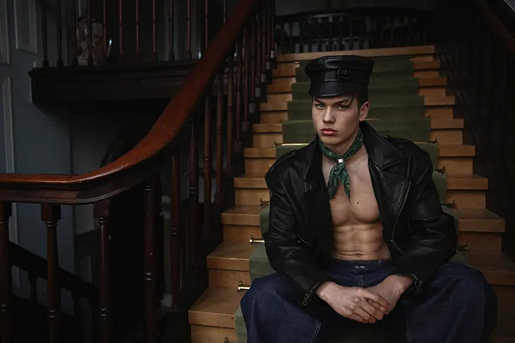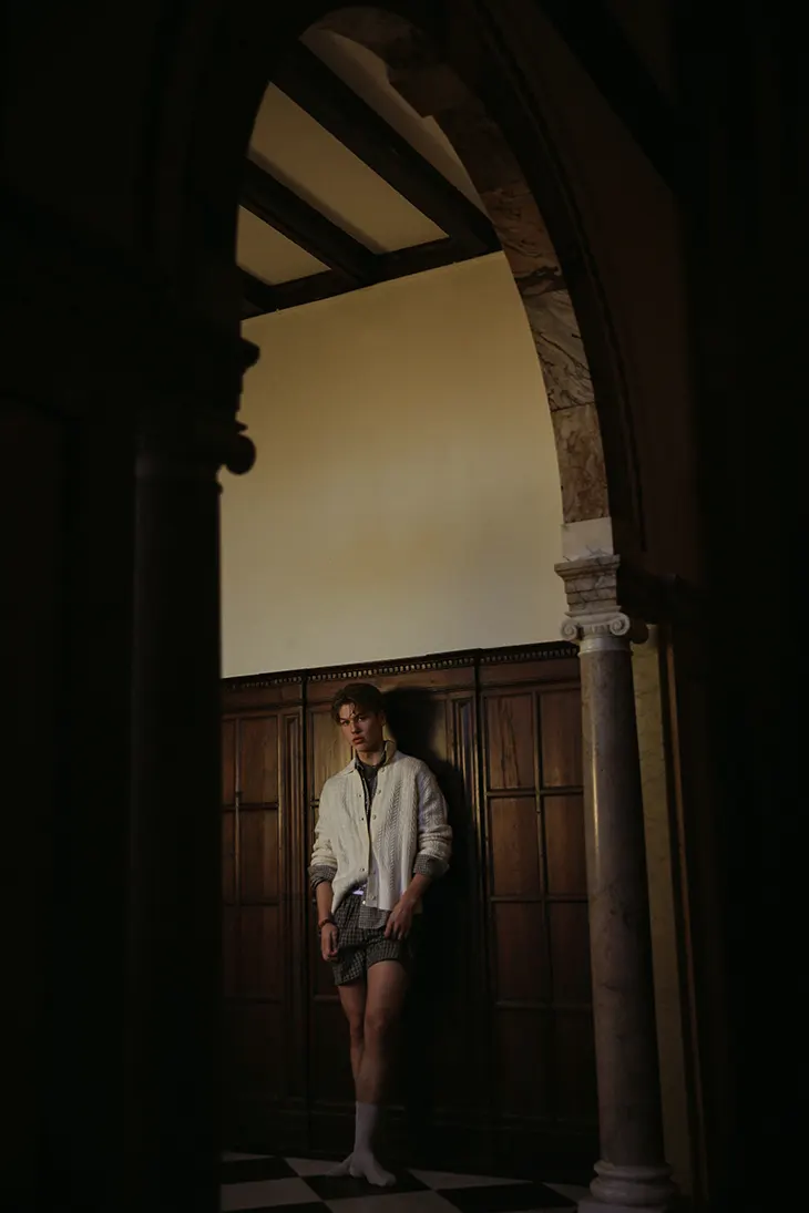 Hessel de Jong moves through a series of composed interiors in a new MMSCENE STYLE STORIES editorial photographed and styled by Martijn Smouter, with Arjen van Baren appearing in select moments. The story builds on controlled tension, where framing, posture, and stillness shape each image. The setting carries a cinematic weight, with staircases, tiled floors, and filtered light.