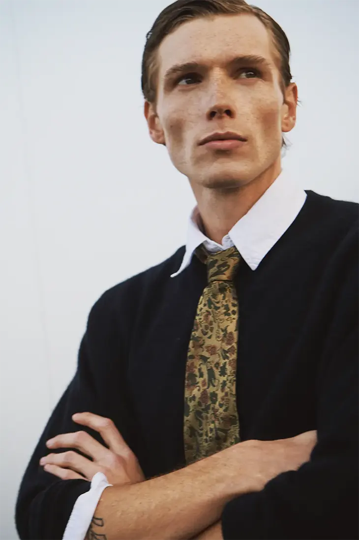 Shirt, Pants & Tie: Stylist’s own, Coat: MARTYRS, Boots: Courtesy of Contessa Miseria Archivio