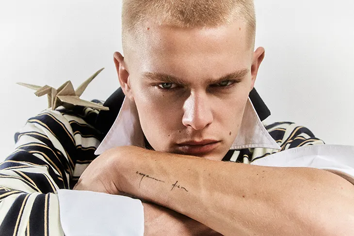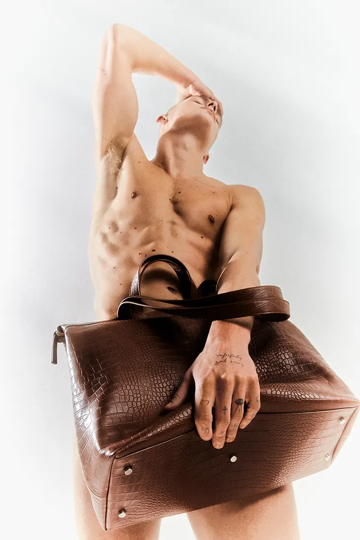 Art direction by Michele Sole and Thomas Micci shapes the visual direction, keeping attention on the body as both subject and surface. Styling by Michele Sole features Bonfilio, Kvrtstvff, Marsèll, Alfonso Sirica, Msgm, Evanbejamin, LAG World, Paraiso, Sebago, and Cascinelli. Production by Thomas Micci supports the stripped approach, while make-up by Asja Redolfi maintains a natural finish.
