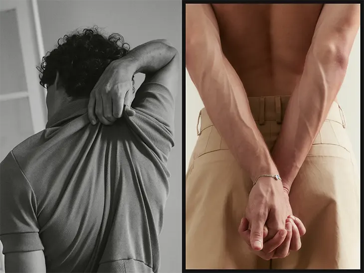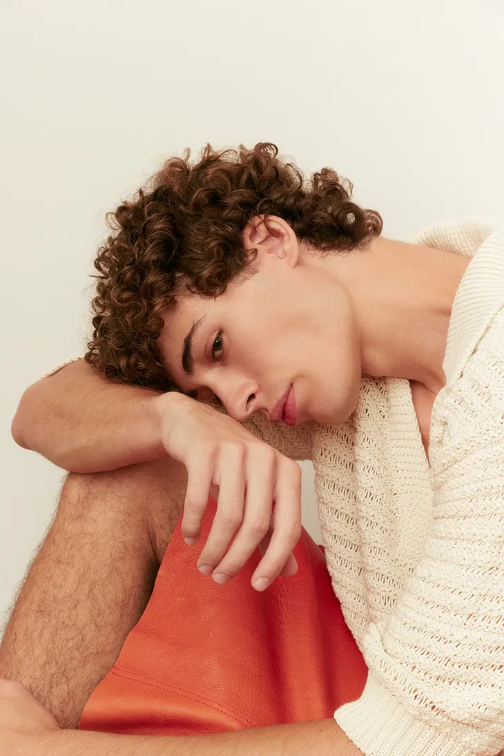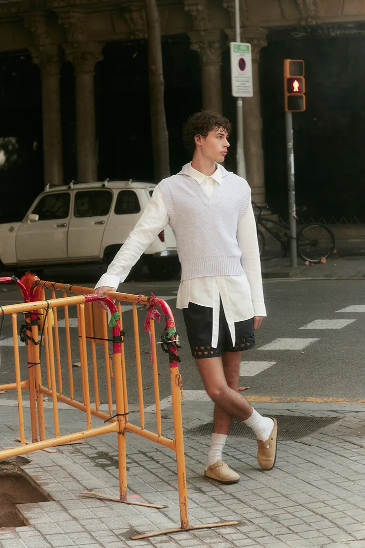 Styling by Carlos Venegas and Ivanca Vera shapes the editorial through disciplined silhouettes and tactile contrasts. Tailored shirting, knitwear, sculpted shorts, and refined accessories shape the wardrobe. Pieces from Cartier, Dueros, Isoli, Llamazares y Delgado, Nude Project, Sombras, and Tommy Hilfiger anchor the looks. With Laura Roxley assisting on photo and light, the production maintains sharp focus on texture, skin, and form.