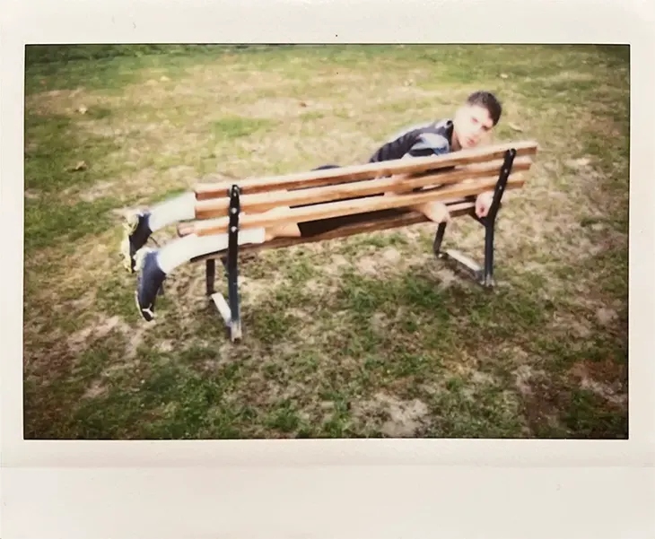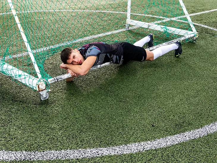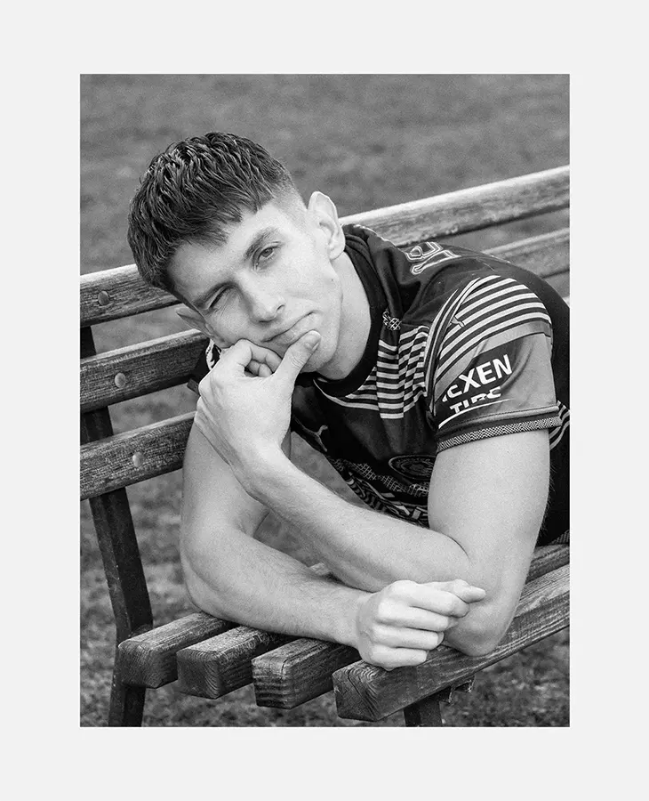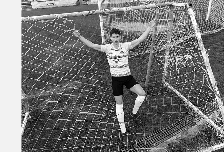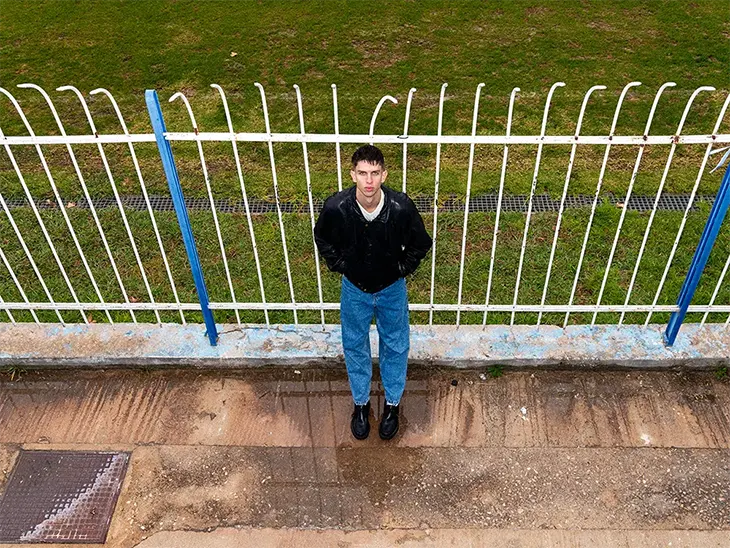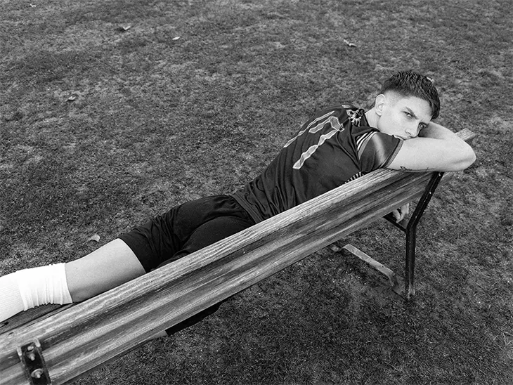 Aggelos Tzaferis at Ace Models Greece is photographed for the MMSCENE PORTRAITS editorial The Quiet Game by Labros Tyrlis. The series develops through controlled movement, where posture and timing shape each image. Shot across a football field and the areas around it, the setting keeps the frame open and direct, using space to shape the mood without emphasis.