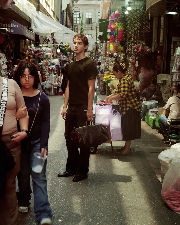 Photographer Giovanni Cardenas captures model Jonah Folks in a raw series for MMSCENE PORTRAITS, shot across the vibrant streets of Mexico City. Navigating the commerce district of La Merced, Jonah moves through the area with quiet focus and steady rhythm.