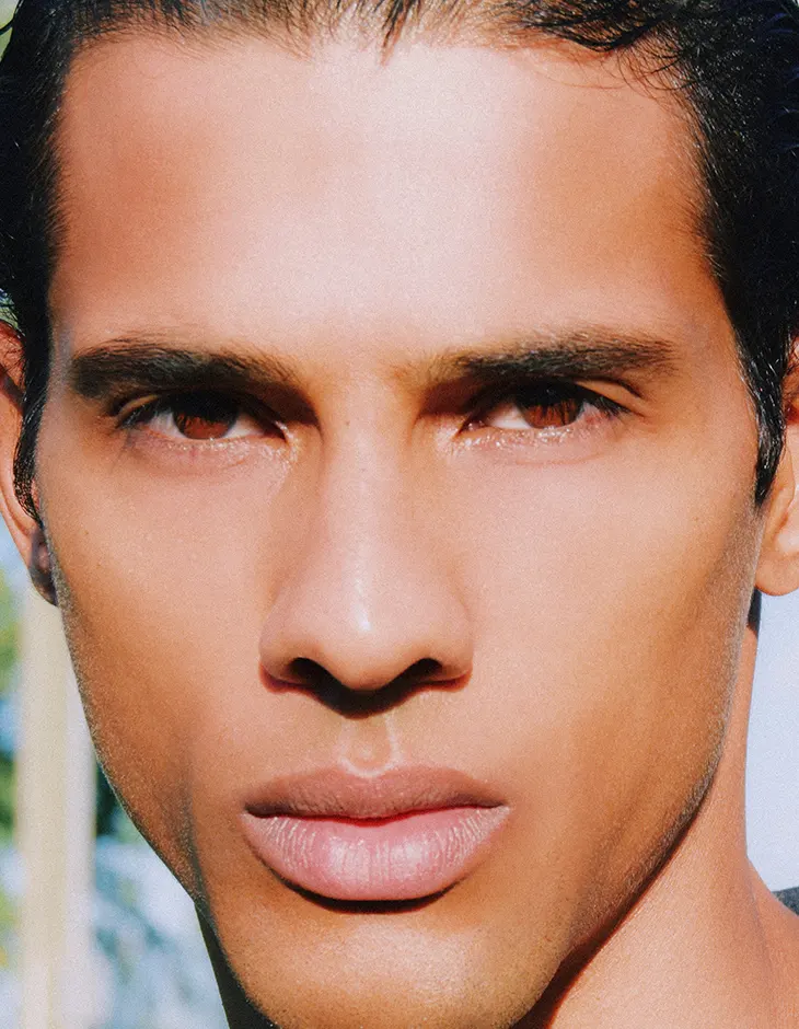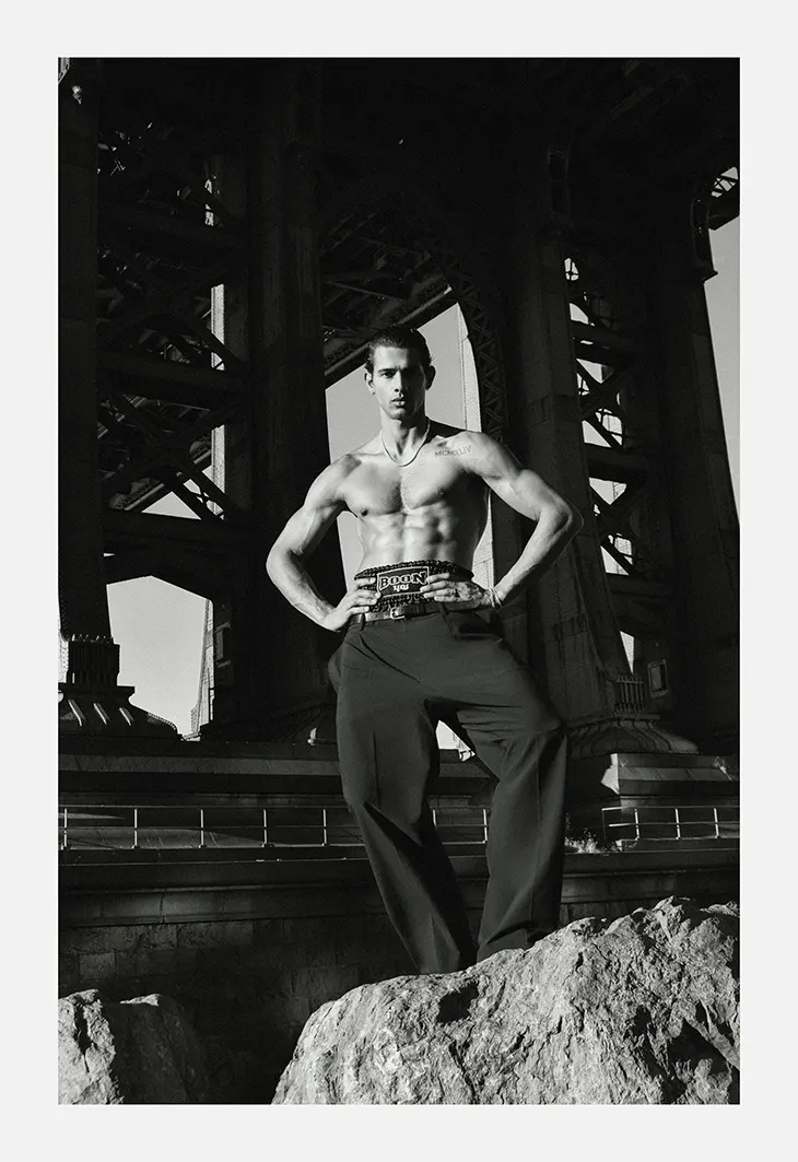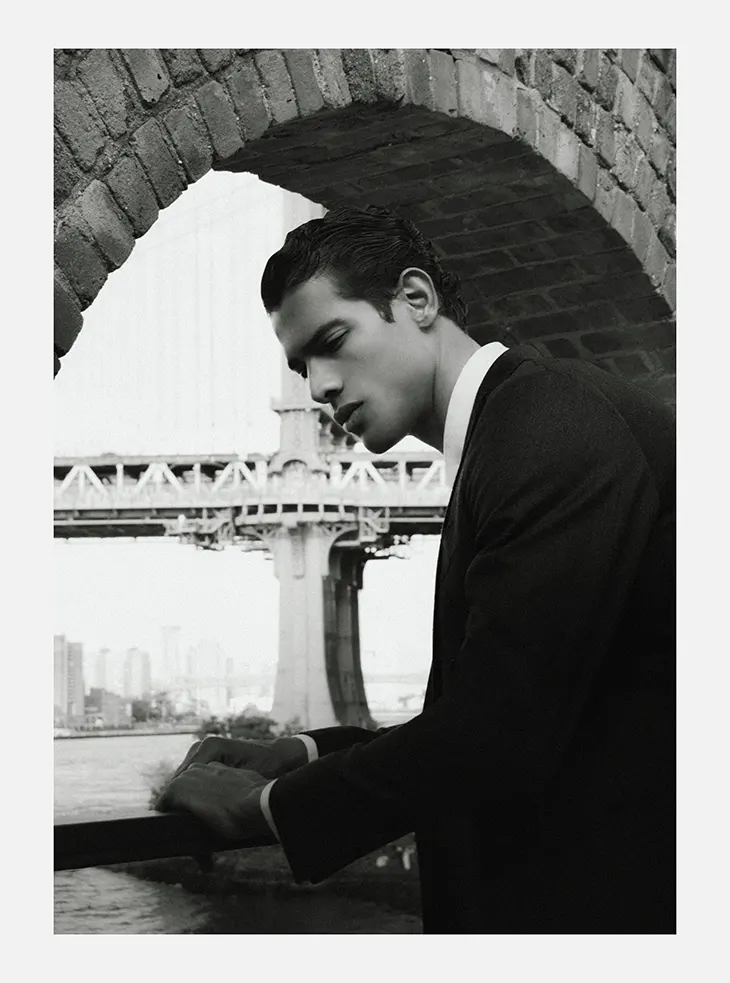 Brazilian model Jonas Barros, represented by IMG Models, takes center stage in the MMSCENE PORTRAITS editorial Love Me More, captured by photographer Elys Berroteran. The series unfolds in an outdoor setting that positions the sharp lines of tailoring against the textures of an urban waterfront and industrial infrastructure. Whether standing along a rocky shoreline with a sweeping bridge and city skyline in the distance, or posing against weathered brick arches, Barros maintains a composed intensity that anchors the visual narrative.