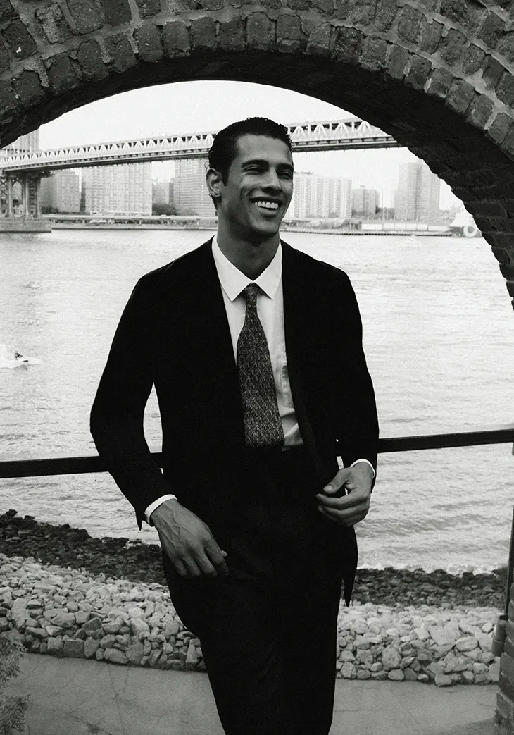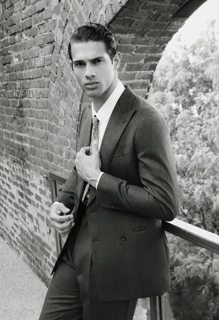 The wardrobe features a curated selection of pieces from Suit Supply, Dolce&Gabbana, and Todd Snyder. Berroteran utilizes natural light to highlight the contours of the model’s physique and the fabric’s texture, alternating between the stark clarity of black and white imagery and the warmth of color shots.
