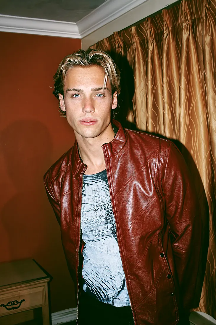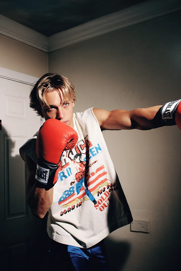 Tanner McCreary at Two Management leads the editorial Fight Club, photographed by Adam Washington for the latest MMSCENE PORTRAITS. Washington builds the story through shifts between indoor grit and outdoor stillness, using vintage references and retro athletic cues to shape the mood. The direction uses tension and stillness, and Washington’s framing centers Tanner throughout the series.