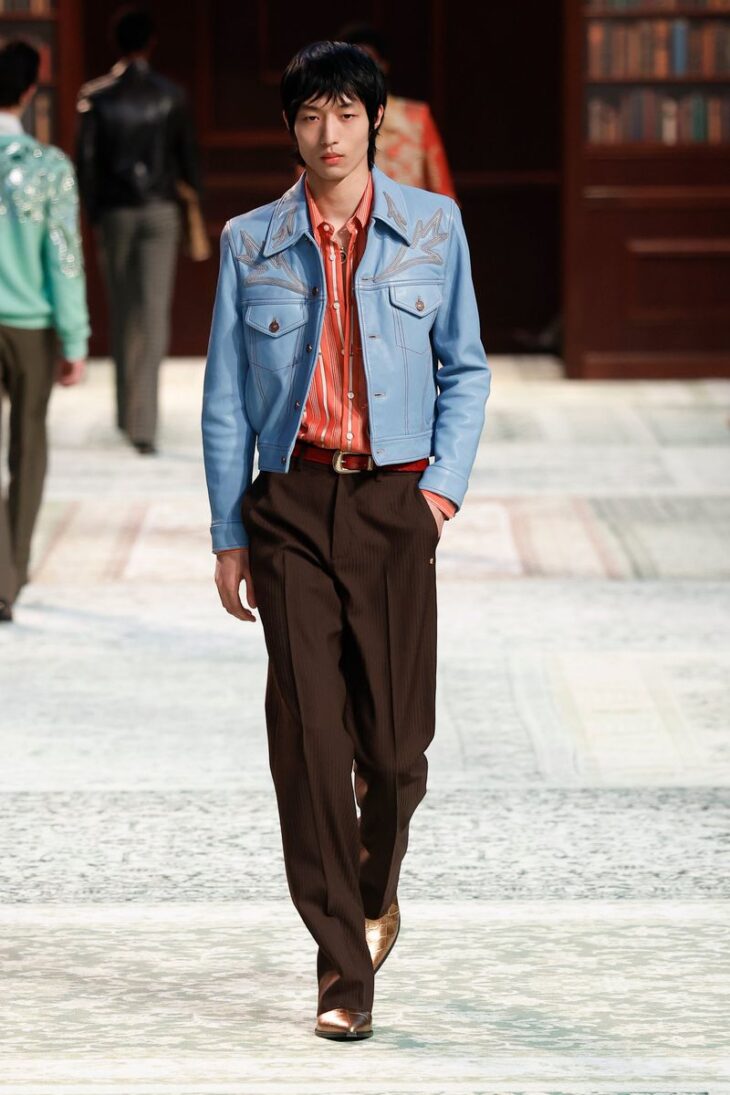 The wardrobe reads as modern American classics filtered through AMIRI’s particular lens: western wear, officer’s jackets, leather, and classic denim, all given detailing expressive of the brand’s savoir-faire. Emblematic tailoring pairs with lean jeans; casual pieces mix with glamorous elements drawn from evening attire. The mood fuses easiness with elegance, on stage and off.