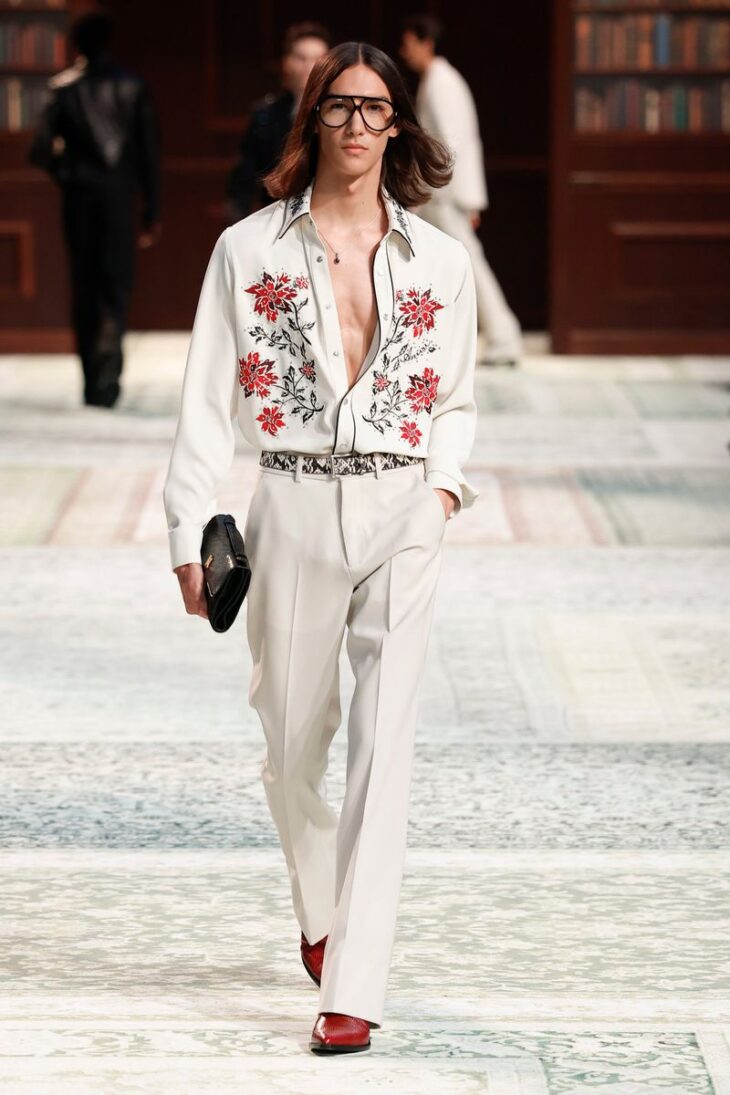 Mike Amiri articulated that philosophy in the show notes: “For me, men’s formalwear is most interesting when it feels effortless and personal. I love the idea of artists wearing tailoring in an informal way, a blazer over a Henley, boots instead of dress shoes. Clothes that feel like an extension of who you are. That balance is the sweet spot for Amiri: something that can exist on stage but also walk right off into real life.”