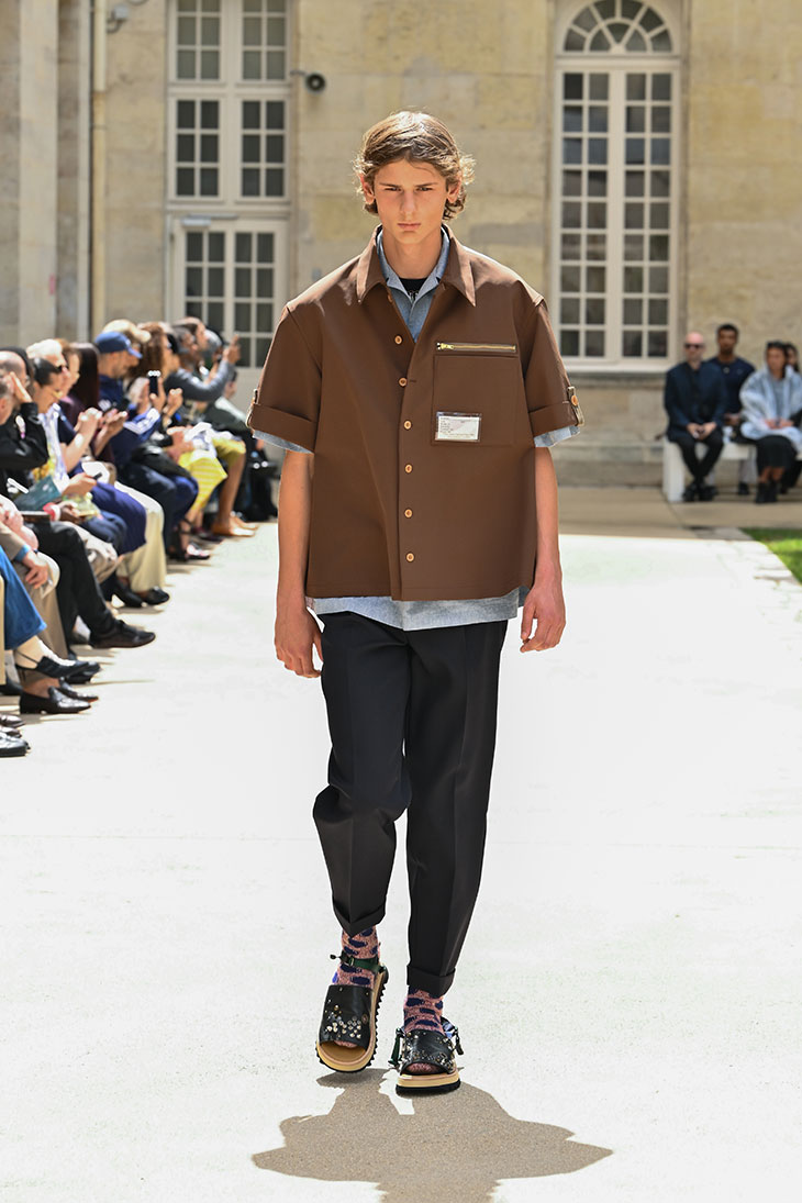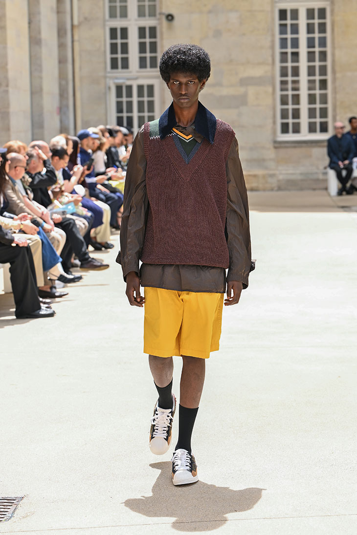 Junichi Abe has been pursuing the concept of “very simple but very strong looks,” as he articulated backstage before the spring Kolor show. This direction was heavily influenced by uniforms, which Abe sees as the epitome of functional and memorable design. He also drew inspiration from sports uniforms and security gear, adding a vibrant touch to the collection with colors like dark teals, yellow, and purple, alongside more muted tones of beige, khaki, and olive green.