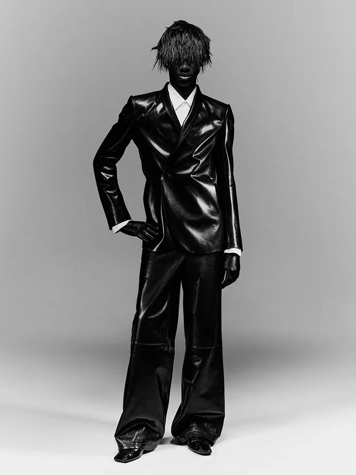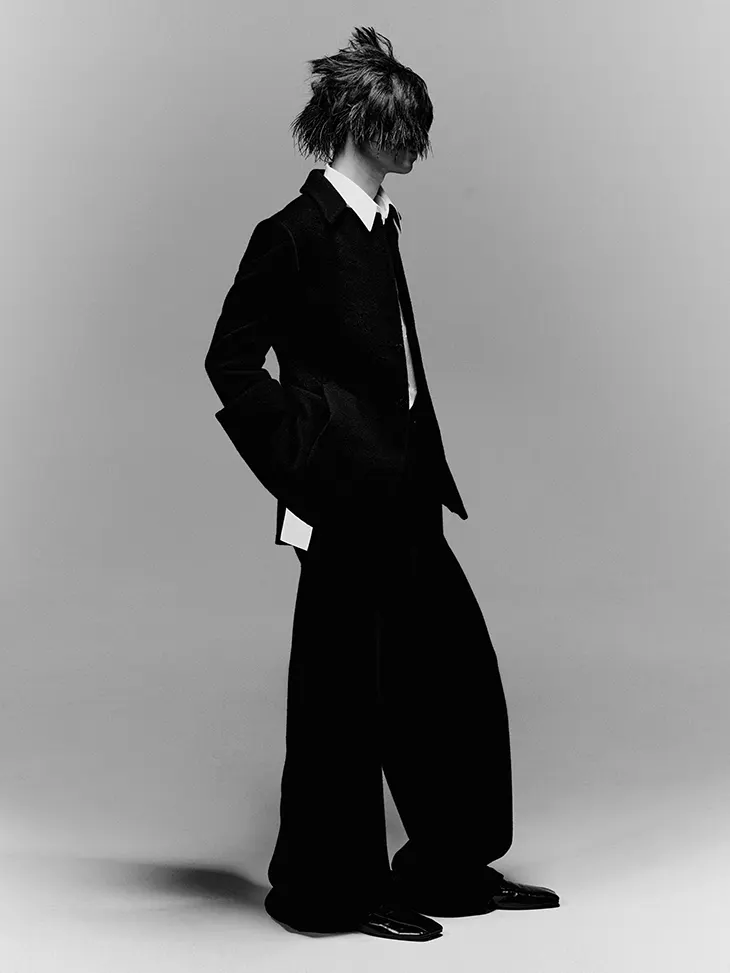Photographer Jiaji Jin captured the collection in stark black-and-white imagery that emphasized silhouette over detail. Stylist Evan Feng layered the looks to reinforce the “second skin” concept -crinkled leather jackets over elongated shirts with curved, overlapping hems; voluminous bombers swallowing the frame; sharp-shouldered blazers with scalloped front panels creating tension between precision and fluidity.