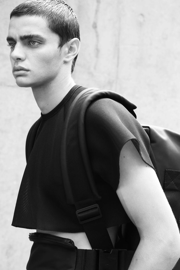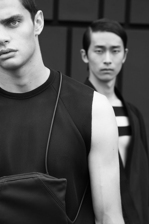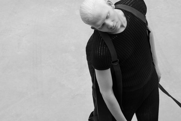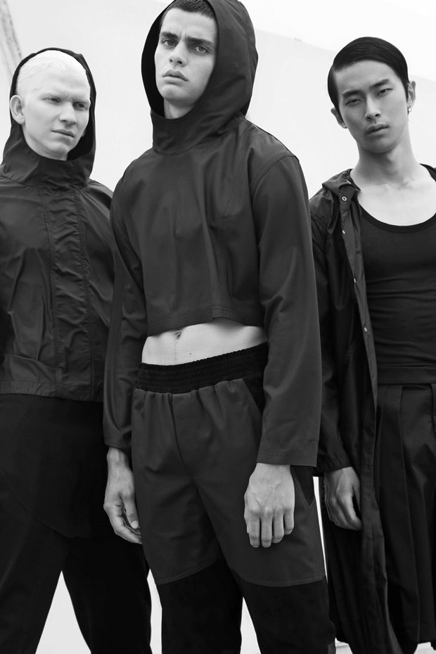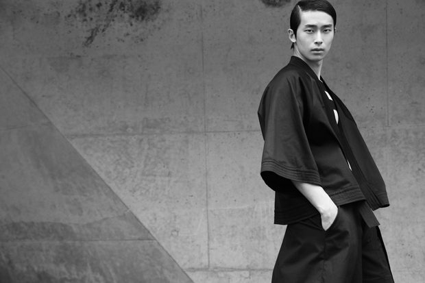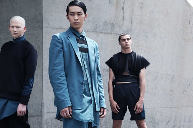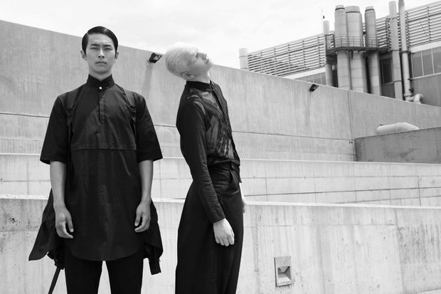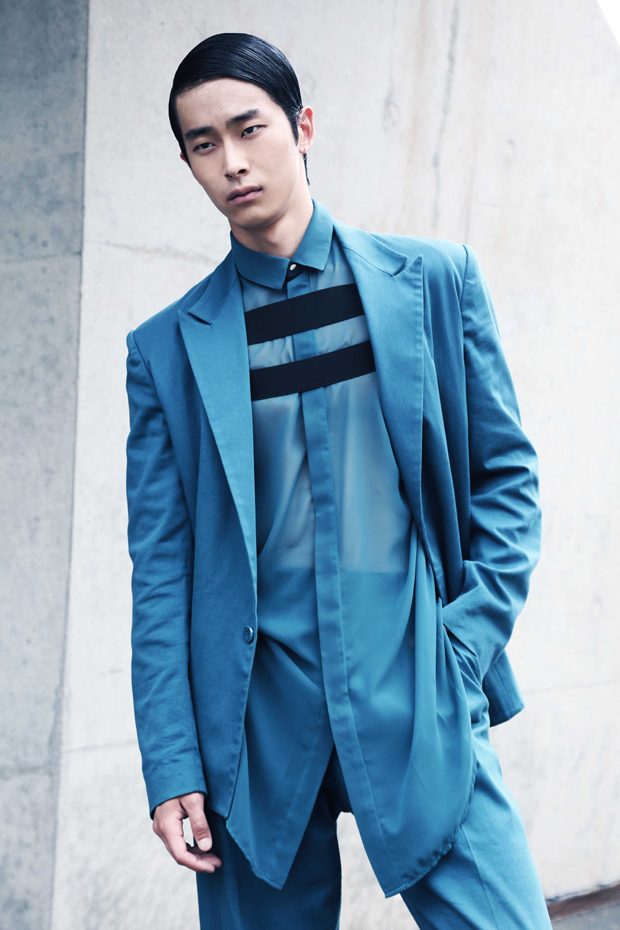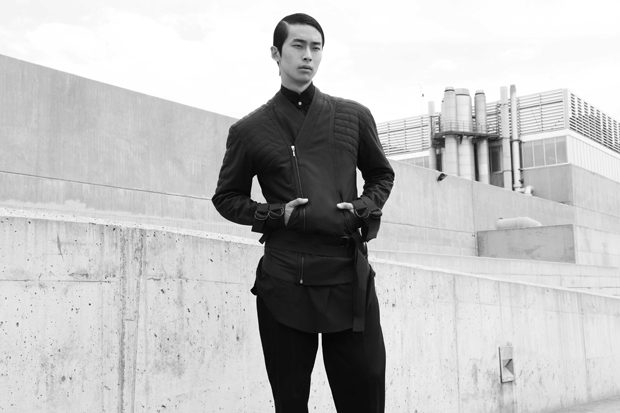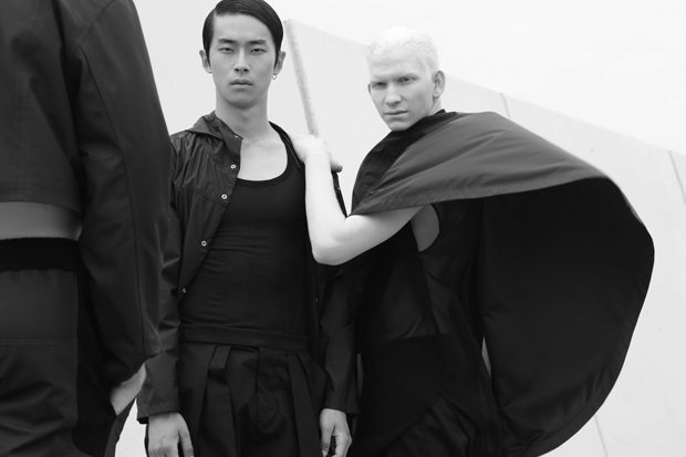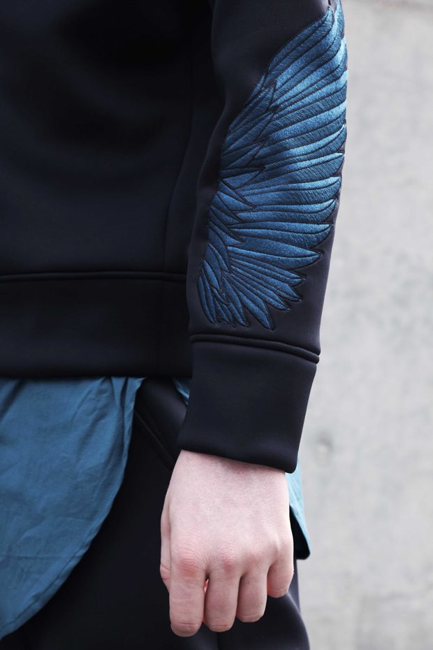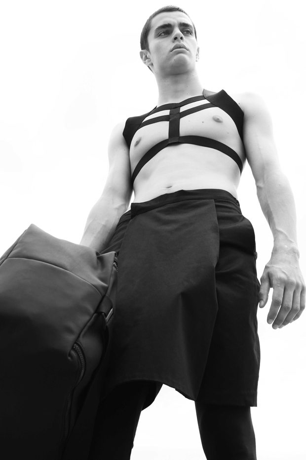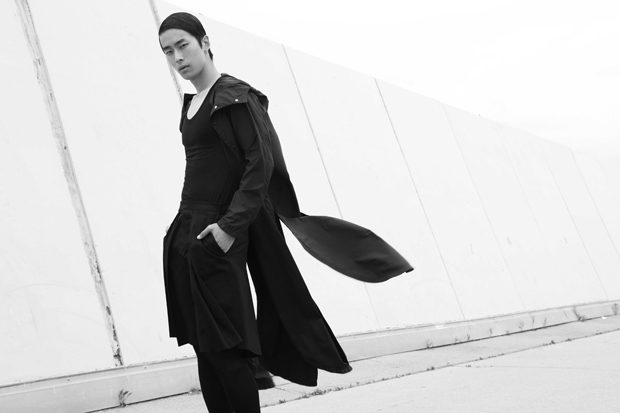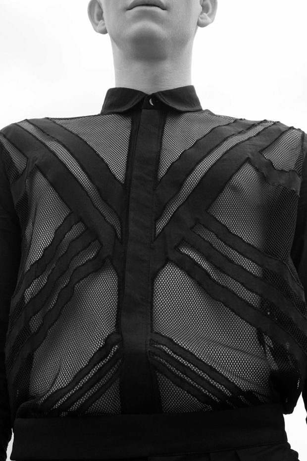 Each garment has its own story and message within the collection; it is transmitted through the fabric combination, cut, or graphic symbols made through fabric manipulation and other techniques. Such as the harnesses that appear in the collection are an interpretation of dreams catchers used by the Native Americans or the ribbing on a leather jacket referring to a 12th century Heian armour. – from Jnorig
